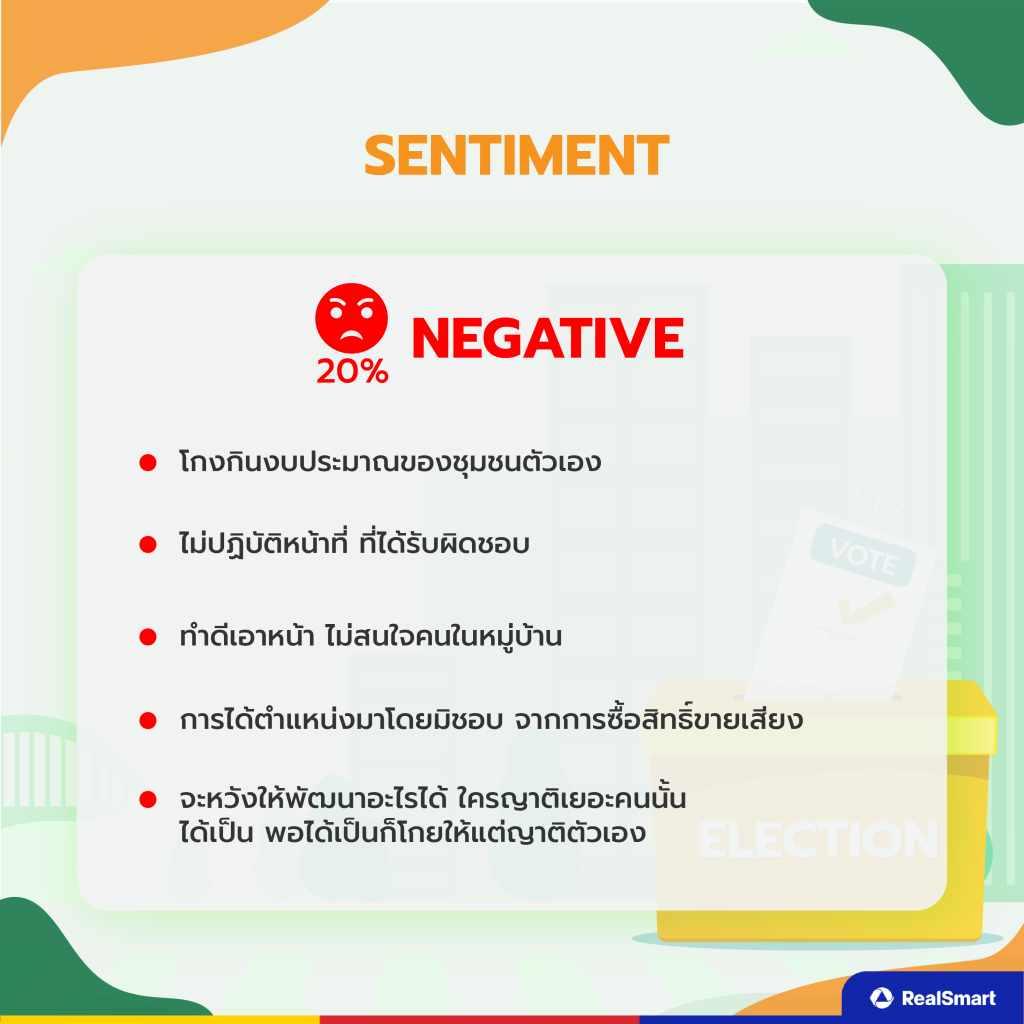 Negative Sentiment 20% มองว่าคนที่เข้ามาก็โกงกินงบประมาณของชุมชนตัวเอง ไม่ปฏิบัติหน้าที่ที่ได้รับผิดชอบ ทำดีเอาหน้า จะหวังให้พัฒนาอะไรได้ ใครญาติเยอะคนนั้นได้เป็น พอได้เป็นก็โกยให้แต่ญาติตัวเอง ไม่สนใจคนในหมู่บ้าน