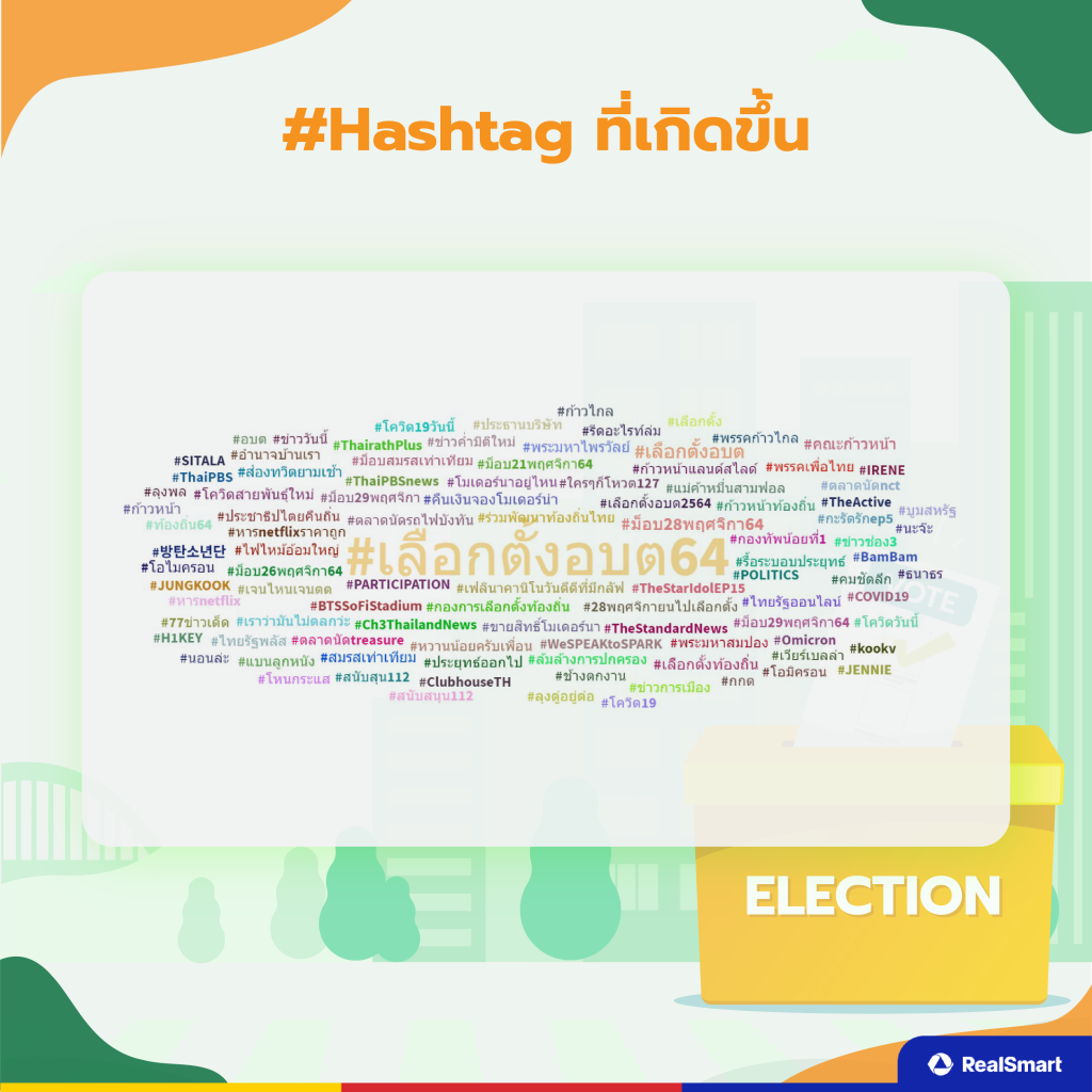 Top #Hashtag ที่เกิดขึ้นเกี่ยวกับกระแสการเลือกตั้ง อบต. 2564 มีอยู่มากมาย แต่มี #Hashtag ที่เห็นได้ชัดเจนไม่ว่าจะเป็น #เลือกตั้งอบต64 #ร่วมพัฒนาท้องถิ่นไทย #28พฤศจิกายนไปเลือกตั้ง และอื่น ๆ หากใครสนใจสามารถไปตามดูใน Hashtag เกิดขึ้นได้เช่นกัน