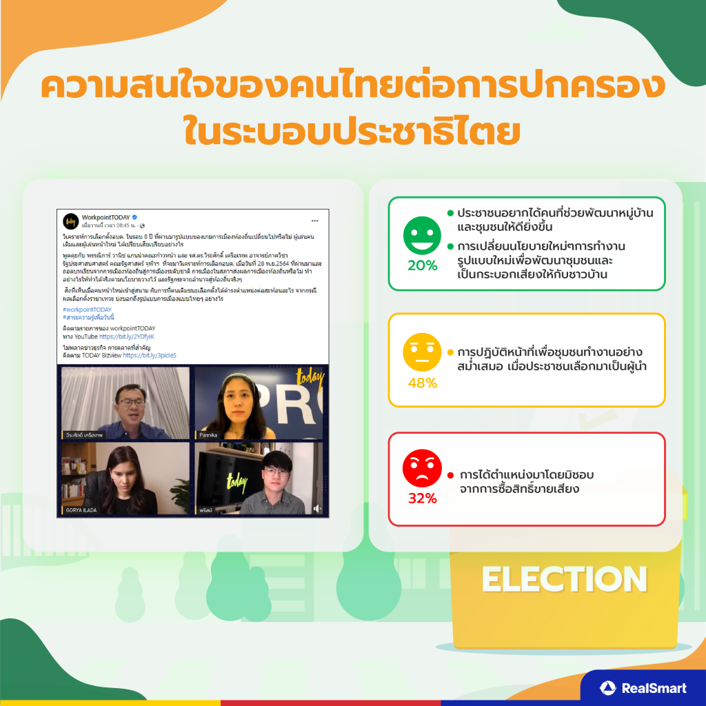 แล้วประชาชนที่มีสิทธิ์ มีเสียงในการเลือกตั้งคิดเห็นอย่างไร และมีมุมมองแบบไหนกับการที่จะเลือกคนให้เข้ามาบริหารประโยชน์ในพื้นที่ของตัวเอง ทาง Real Smart ได้ใช้เครื่องมือ Social Listening Tools เก็บรวบรวมข้อมูลออกมาเป็นแต่ละประเด็นแล้วเราได้ทำการแบ่งออกมาเป็นหัวข้อต่าง ๆ ดังนี้
