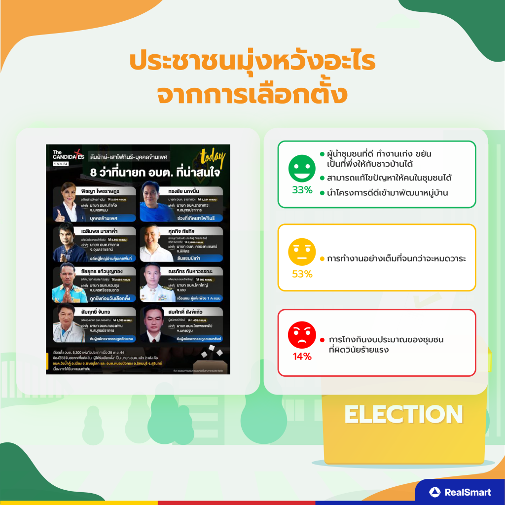 • Positive (ความเห็นเชิงบวก) 20% ประชาชนอยากได้คนที่ช่วยพัฒนาหมู่บ้านและชุมชนให้ดียิ่งขึ้น พร้อมเปลี่ยนแปลงนโยบายใหม่ ๆ ในการทำงานและเป็นกระบอกเสียงให้กับชาวบ้าน