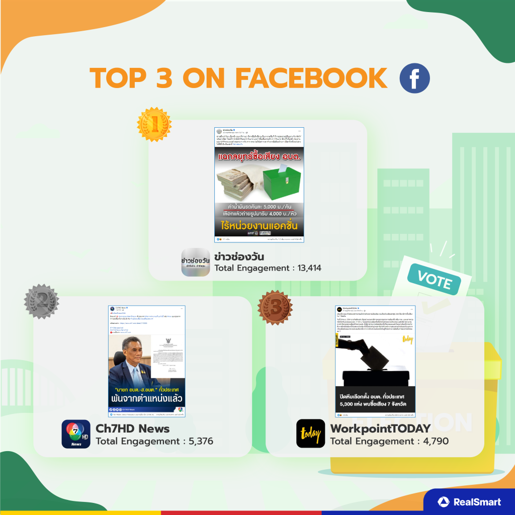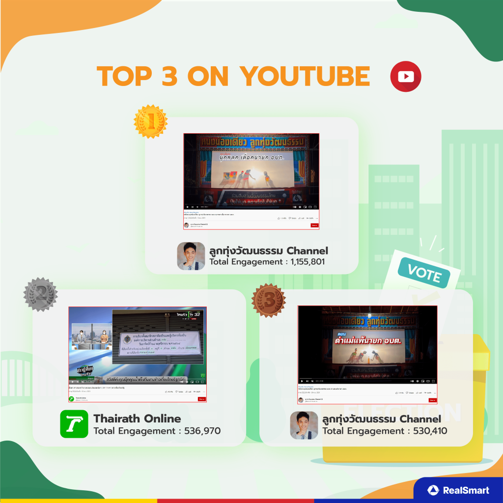 เซอร์ไพรส์ไม่น้อยกับอันดับที่ 1 และ 3 บน YouTube กับช่อง “ลูกทุ่งวัฒนธรรม Channel” ที่ได้นำประเด็นการเลือกตั้ง อบต. มาแสดงโชว์เป็นหนังตะลุงล้อเลียนการเลือกตั้ง ทำให้รับ engagement สูงมาก ส่วนอันดับที่ 2 คือ Thairath สำนักข่าวที่ได้รับ engagement สูงอยู่แล้วในประเด็นต่าง ๆ เนื่องจากมีผู้ติดตามที่สูงอยู่แล้ว