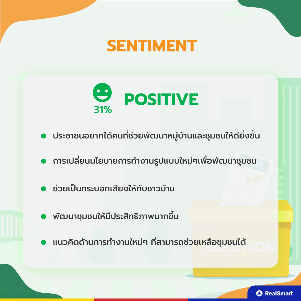 Positive Sentiment 31% รู้สึกว่าอยากได้คนที่ช่วยพัฒนาหมู่บ้านและชุมชนให้ดีขึ้น เปลี่ยนนโยบายการทำงานรูปแบบใหม่เพื่อพัฒนาชุมชนให้มีประสิทธิภาพมากขึ้น รวมถึงช่วยเป็นกระบอกเสียงให้กับชาวบ้าน