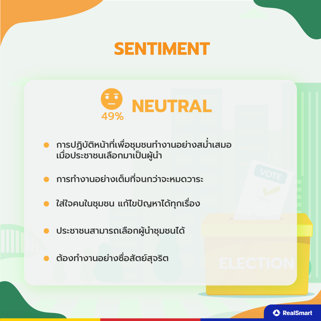 • Neutral (ความเห็นทั่วไป) 48% มองว่าเมื่อประชาชนเลือกมาเป็นผู้นำแล้วอยากให้ปฏิบัติหน้าที่เพื่อชุมชนอย่างสม่ำเสมอ