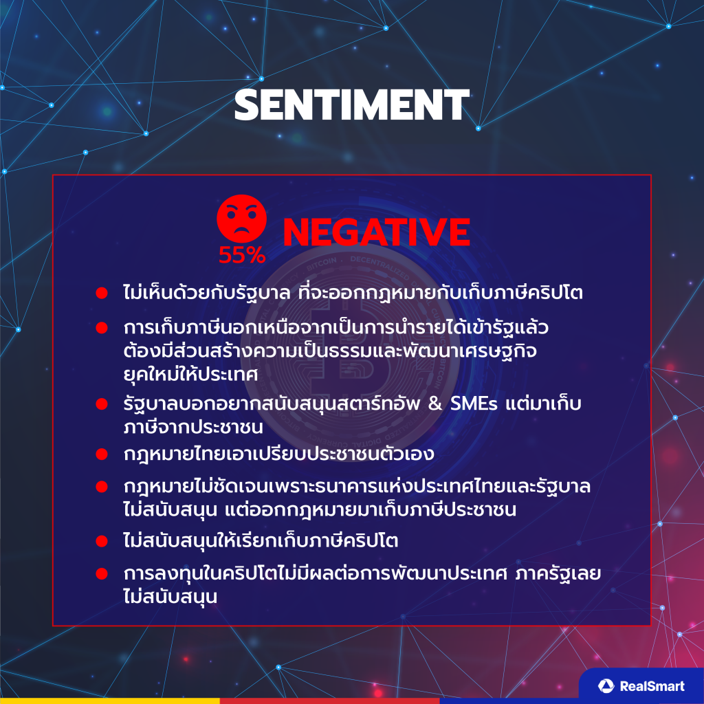 • Negative Sentiment (ความเห็นเชิงลบ) 55% ส่วนใหญ่ไม่เห็นด้วยกับรัฐบาลที่ออกกฎหมายการเก็บภาษีคริปโตนั้นเอาเปรียบประชาชน แทนที่จะมาเก็บภาษีอยากให้รัฐบาลสนับสนุนสตาร์ทอัพ กับ SMEs มากกว่า