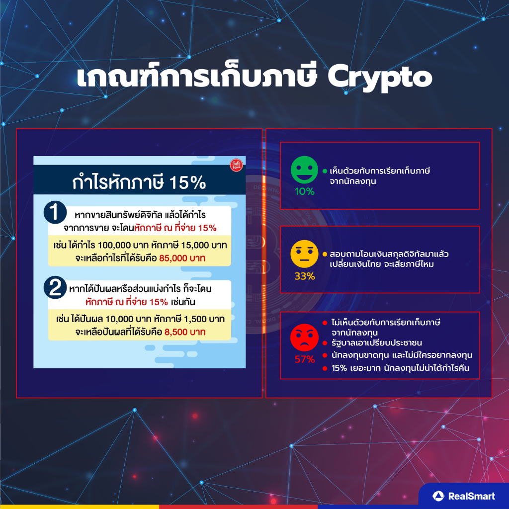 มีเพียง 10% ที่มองว่าควรเรียกเก็บภาษีจากนักลงทุน อีก 33% ที่มาสอบถามเรื่องการโอนเงินสกุลดิจิทัลเปลี่ยนเป็นเงินไทยจะเสียภาษีไหม ส่วนอีก 57% ไม่เห็นด้วยกับการเรียกเก็บภาษีจากนักลงทุน การเก็บถึง 15% นั้นเอาเปรียบมากเกินไป ทำให้ไม่มีใครอยากลงทุนอีก