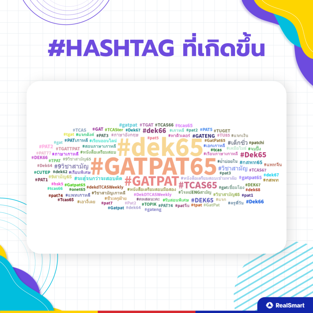 Top #Hashtag ที่เกิดขึ้นเกี่ยวกับการสอบ GAT/PAT 65  นั้นมีอยู่มากมายทั้งภาษาไทยและอังกฤษ แต่ที่เห็นได้ชัดเจนจะเป็น #GATPAT65 #DEK65 #GATPAT และอื่น ๆ หากใครสนใจสามารถไปตามดูใน Hashtag เกิดขึ้นได้เช่นกัน