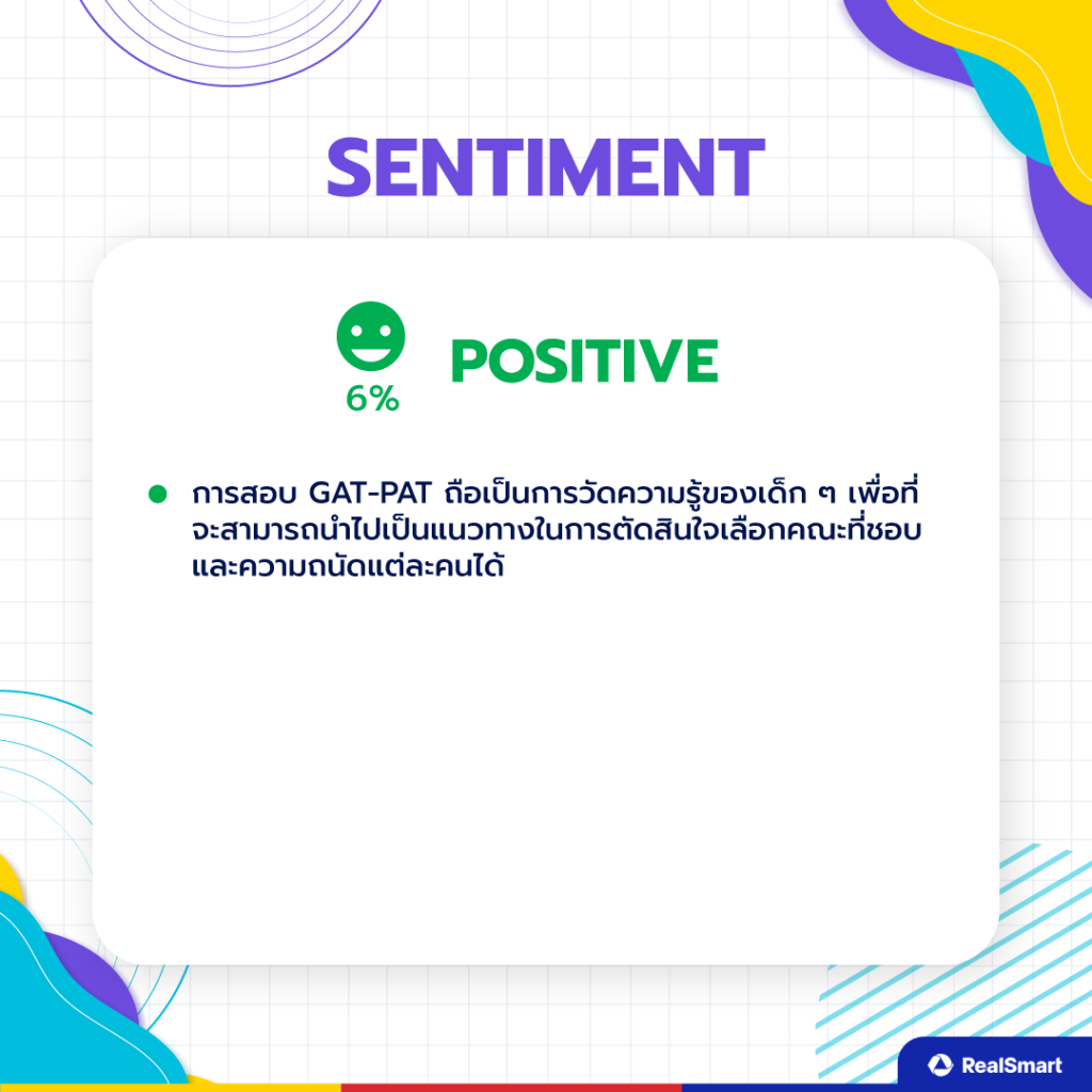 ในส่วนของความเห็นเชิงบวก (Positive Sentiment) มีเพียง 6% มองว่าการสอบ GAT-PAT ถือเป็นการวัดความรู้ของเด็ก ๆ เพื่อที่จะสามารถนำไปเป็นแนวทางในการตัดสินใจเลือกคณะที่ชอบและถนัดของแต่ละคนได้