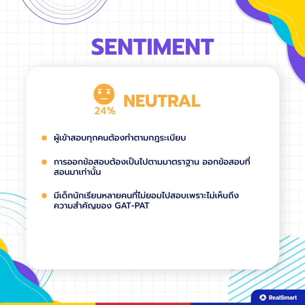 ความเห็นเชิงทั่วไป (Neutral Sentiment) 24% บอกว่าผู้เข้าสอบทุกคนต้องทำตามกฎระเบียบ และข้อสอบควรเป็นไปตามมาตรฐาน ควรออกสอบเท่าที่สอบเท่านั้น และมีนักเรียนหลายคนไม่เข้าสอบเพราะไม่เห็นถึงความสำคัญของ GAT/PAT65
