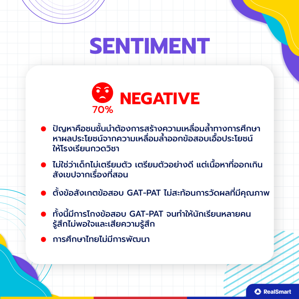 และในส่วนของความเห็นเชิงลบนั้น (Negative Sentiment) 70% บอกว่าปัญหา คือ ชนชั้นนำต้องการสร้างความเหลื่อมล้ำทางการศึกษาเพื่อหาผลประโยชน์เอื้อประโยชน์โรงเรียนกวดวิชา ไม่ใช่ว่าเด็กไม่เตรียมตัว แต่เนื้อหาที่ออกสอบมันเกินสังเขปจากเรื่องที่สอน และหลายคนตั้งข้อสังเกตว่าข้อสอบ GAT/PAT ไม่สะท้อนการวัดผลที่มีคุณภาพ และมีการโกงข้อสอบอีก รวมถึงมองว่าการศึกษาไทยไม่มีการพัฒนา