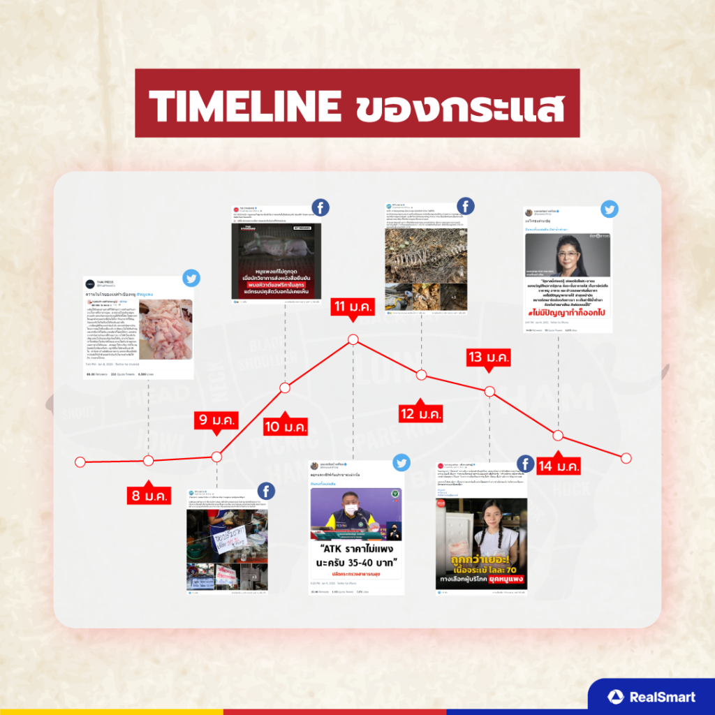 จากภาพรวมทั้งหมดจะเห็นได้ว่ากราฟค่อย ๆ ขยับตัวในช่วงแรก และเริ่มดีดตัวขึ้นอย่างรวดเร็ว และค่อย ๆ ไต่ลงตั้งแต่ช่วงกลาง Timeline ซึ่งในช่วงแรกที่กราฟเริ่มมีการขยับตัวคือวันที่ 8 มกราคม 2565 มี Twitter ส่วนตัวออกมา tweet ถึงข้อความความในใจข้อพ่อค้าแม่ค้าที่ขายหมูที่ออกมาอธิบายว่าทำไมพวกเขาถึงต้องขายในราคาที่สูงขึ้น และก็ขายได้น้อยลงไปอีก ต่อมาในวันที่ 9 มกราคม 2565 กราฟเริ่มขยับตัวสูงขึ้นอีกหลังจากที่ Facebok page : PPTV 36 โพสต์รายงานข่าวเกี่ยวกับร้านอาหารที่มีเมนูที่ใช้หมูขอเพิ่มราคาเมนูนั้น ๆ ขึ้นอีก จนทำให้บางร้านไม่อาจแบกรับราคาวัตถุดิบไหวจนต้องลดการสั่งวัตถุดิบลงไป
