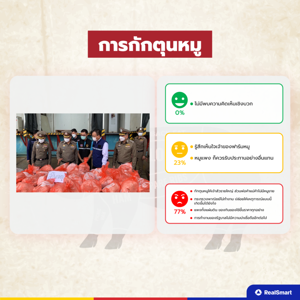 จากข้อมูลที่ได้มาคนส่วนใหญ่แสดงความเห็นเชิงลบกว่า 77% มองว่ากระทรวงพาณิชย์ไม่ทำงาน ปล่อยให้เหตุการณ์นี้ขึ้นได้ยังไง ของแพงไปหมด ของกินของใช้ราคาขึ้นทุกอย่างรวมถึงมีการกักตุนหมูให้เจ้าสัวรายใหญ่อีก ทำให้พ่อค้าแม่ค้าไม่มีเนื้อหมูมาขาย อีก 23% รู้สึกเห็นใจเจ้าของฟาร์มหมู รวมถึงมองว่าถ้าหมูแพงให้หันไปทานอย่างอื่นแทน สุดท้ายไม่พบความเห็นเชิงบวกในประเด็นนี้