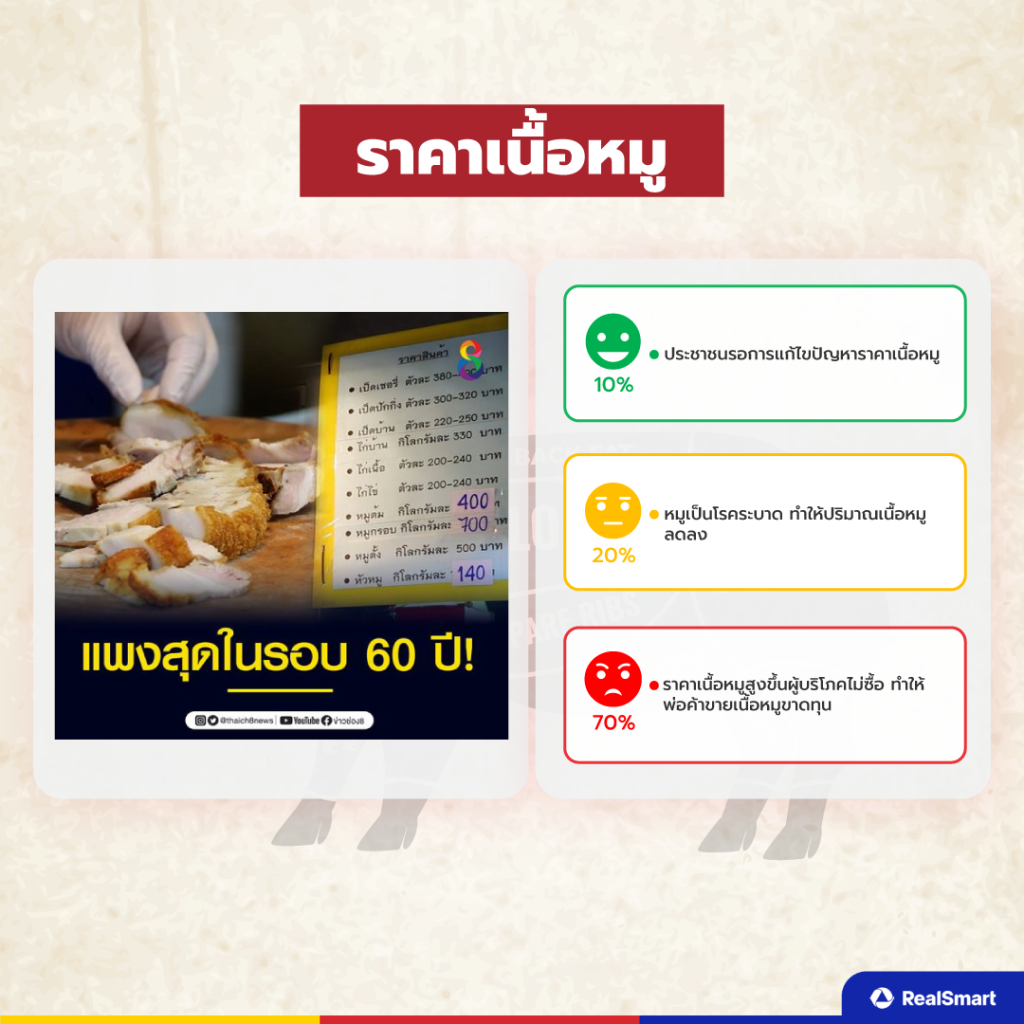 “ราคาเนื้อหมู”ข้อมูลที่ได้จาก Social listening นั้นจะเห็นได้ว่ามีถึง 70% ที่มองว่าราคาเนื้อหมูสูงขึ้น ทำให้คนไม่ซื้อ ยิ่งทำให้พ่อค้าแม่ค้าขาดทุน ส่วนอีก 20% บอกว่าหมูติดโรคระบาด ส่งขายเนื้อหมูขายได้น้อยทำให้ราคาหมูแพงขึ้น และอีก 10% ที่รอการแก้ไขปัญหาราคาเนื้อหมูที่แพง