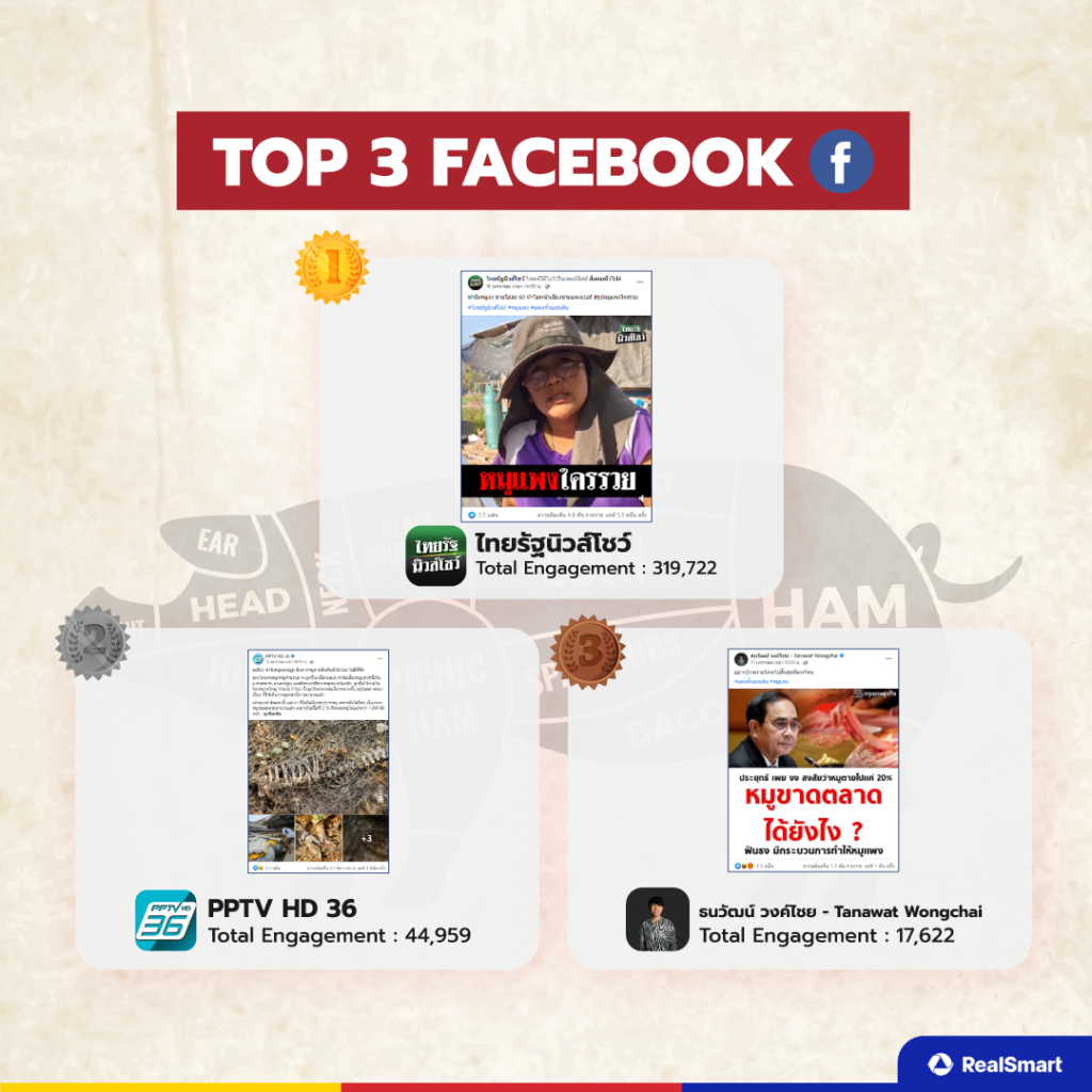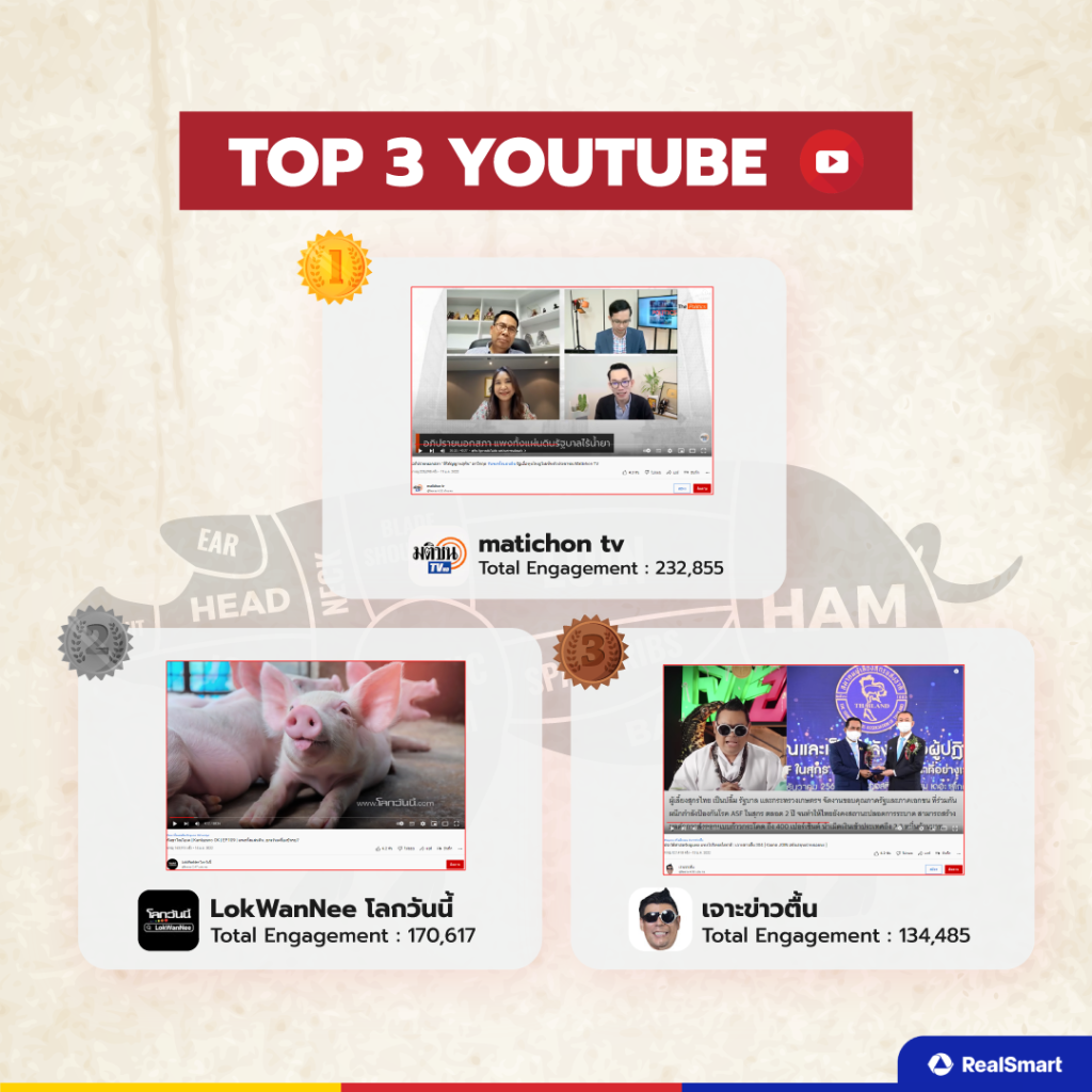 ในส่วนของอันดับที่ 1 อย่างสำนักข่าวมติชน ย่อมได้รับความสนใจแน่นอนจากการที่มีการพูดคุยถึงเรื่องหมูแพงโดยนักวิเคราะห์ ส่วนอันดับที่ 2 สร้างเซอร์ไพรส์เลยก็ว่าได้อย่าง YouTube Channel : LokWanNee โลกวันนี้ ที่ดำเนินรายการโดยพระพยอม ที่ออกมาพูเถึงประเด็นหมูแพงในวิดีโอดังกล่าว ส่วนอันดับที่ 3 อย่าง เจาะข่าวตื้น สายตำหนิรัฐบาลในประเด็นต่าง ๆ เป็นเรื่องปกติ อีกทั้งที่มีผู้ติดตามสูงทำให้ได้รับยอด engagement ที่สูงเช่นกัน