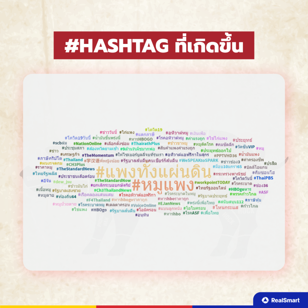 Top #Hashtag ที่เกิดขึ้นเกี่ยวกับประเด็นหมูแพงมีอยู่มากมาย แต่ที่เห็นได้ชัดเจนจะเป็น #หมูแพง #แพงทั้งแผ่นดิน #โรคระบาดในหมู และอื่น ๆ หากใครสนใจสามารถไปตามดูใน Hashtag เกิดขึ้นได้เช่นกัน