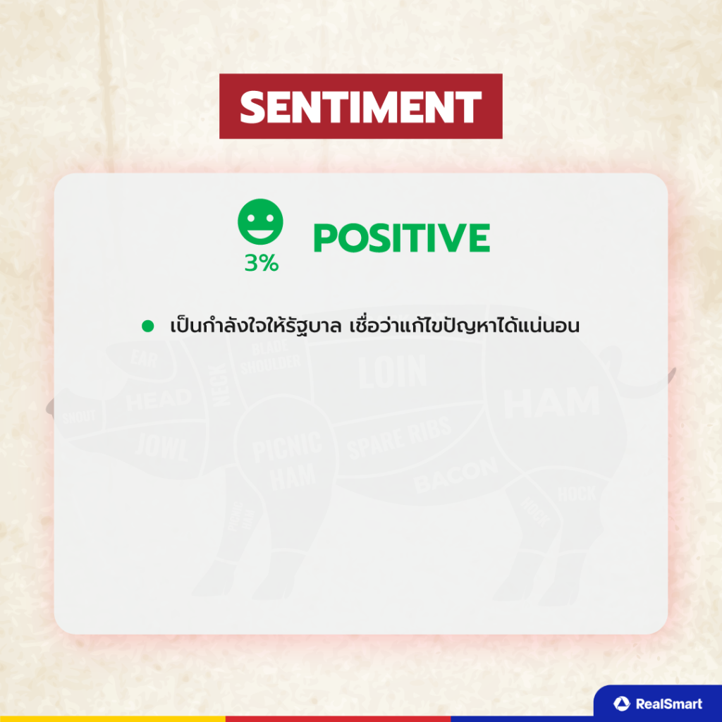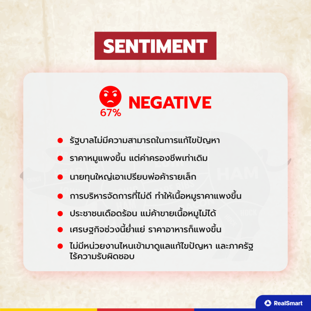 Negative Sentiment (ความเห็นเชิงลบ) 67% มองว่ารัฐบาลไม่สามารถในการแก้ไขปัญหานี้ได้ ราคาหมูแพงขึ้น แต่ค่าครองชีพเท่าเดิม ประชาชนเดือดร้อนพ่อค้าแม่ค้าขายเนื้อหมูไม่ได้ หรือได้น้อยมาก ๆ และไม่มีหน่วยงานไหนเข้ามาดูแลแก้ไขปัญหาอีก