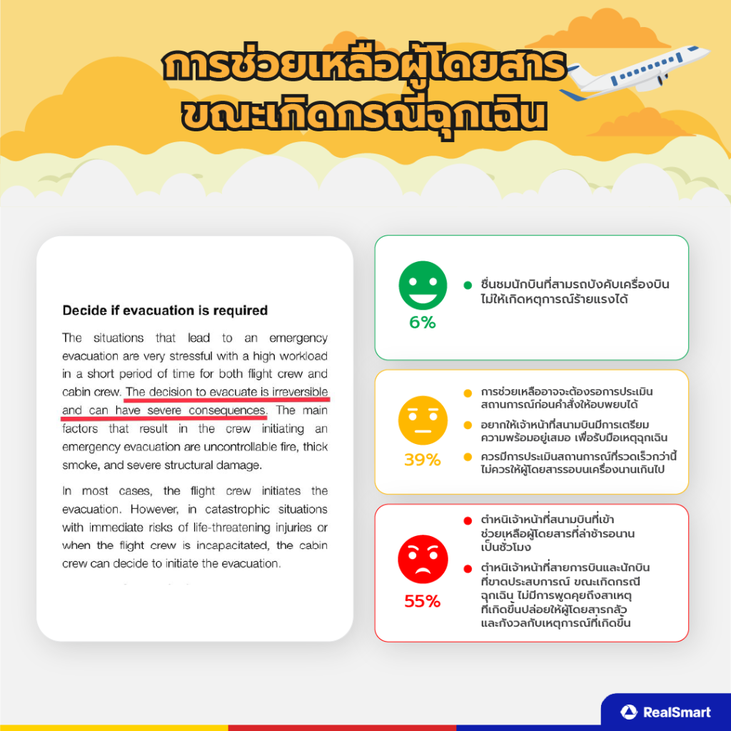 จากข้อมูลที่ RealSmart รวบรวมผ่าน Social Listening มานั้นพบประเด็นเกี่ยวกับความปลอดภัยในการเดินทางโดยเครื่องบินจากเหตุการณ์เครื่องบินไถลออกนอกรันเวย์ที่ได้รับความสนใจจากคนไทยในโลกออนไลน์อยู่ 2 ประเด็น คือ ความปลอดภัยในการเดินทางด้วยเครื่องบิน และ การช่วยเหลือผู้โดยสารขณะเกิดกรณีฉุกเฉิน ที่นี่เรามาเจาะลึกไปทีละประเด็นกัน