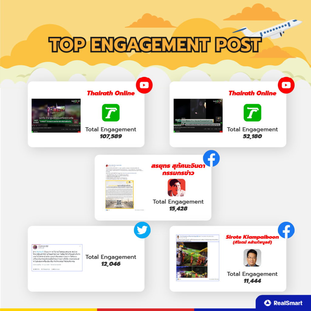 ในส่วนของ Top Engagement post พบว่า YouTube Facebook และ Twitter ยังคงเป็นช่องทางที่คนไทยติดตามสถานการณ์ต่าง ๆ ที่เกิดขึ้นได้อย่างรวดเร็วทำให้มี Engagement ที่สูง โดยเฉพาะสำนักข่าวไทยรัฐ และสรยุทธ ได้รับ engagement ที่สูงเนื่องจากการรายงานสถานการณ์ที่เกิดขึ้นตลอด