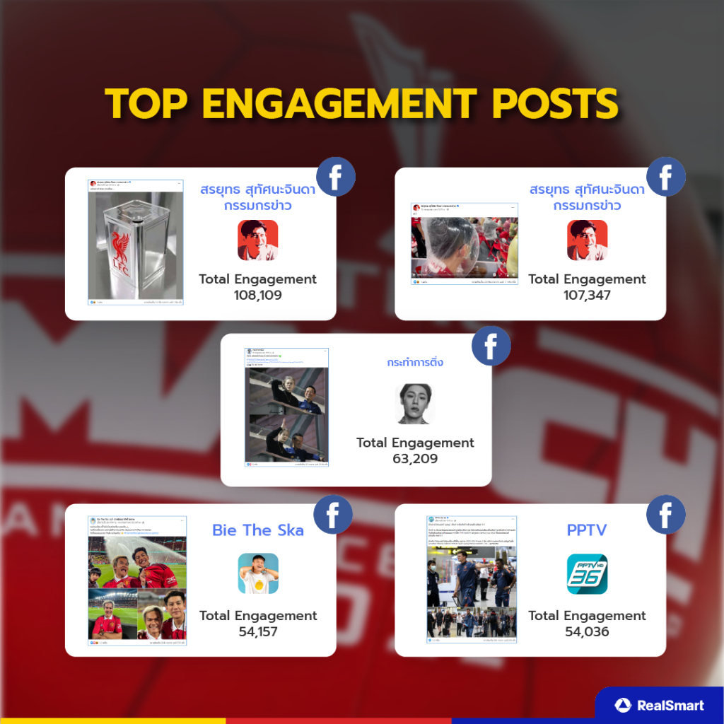 ในส่วนของ Top Engagement post พบว่า Facebook เป็นช่องทางหลักที่คนติดตามงาน THE MATCH BANGKOK CENTURY 2022 เนื่องจากสามารถติดตามข่าวสารต่าง ๆ ได้ง่าย ไม่ว่าจะเป็นคนมีชื่อเสียง นักข่าว สำนักข่าว ที่อัปเดตงานสม่ำเสมอ