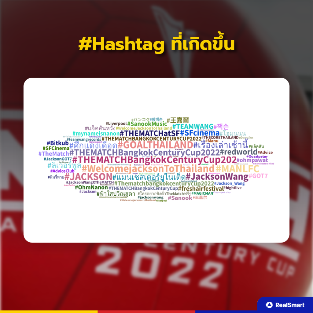 Top #Hashtag ที่เกิดขึ้นเกี่ยวกับTHE MATCH BANGKOK CENTURY 2022 ศึกแดงเดือด นั้นมีอยู่มากมาย แต่ที่เห็นได้ชัดเจนที่เป็นภาษาไทยและภาษาอังกฤษ  #THEMATCHBangkokCenturyCup2022  #ศึกแดงเดือด  #แมนเชสเตอร์ยูไนเต็ด #ลิเวอร์พูล  และอื่น ๆ หากใครสนใจสามารถไปตามดูใน Hashtag เกิดขึ้นได้เช่นกัน