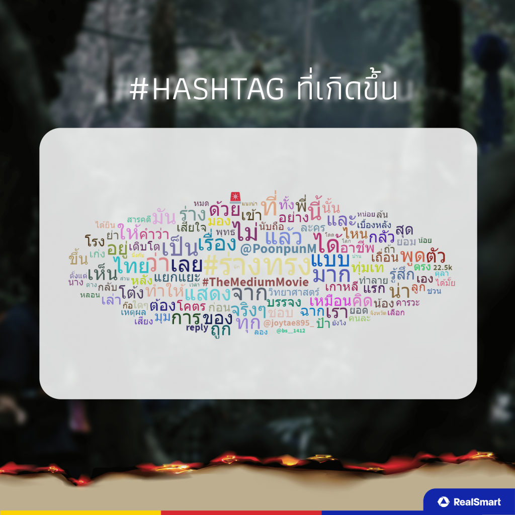 Top Hashtags ที่เกิดขึ้นเกี่ยวกับภาพยนตร์ “ร่างทรง” มีมากมาย แต่ #Hashtag ที่เห็นได้ชัดเจนไม่ว่าจะเป็น  #ร่างทรง #movietwit #ThemediumMovie #rangzong และอื่น ๆ ทั้งภาษาไทยและภาษาอังกฤษ ซึ่งถ้าใครสนใจก็สามารถไปติดตามบทสนทนาที่เกี่ยวข้องด้วย Hashtags เหล่านี้ได้เช่นกัน