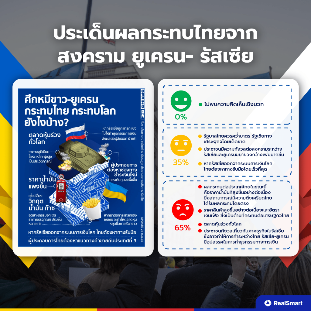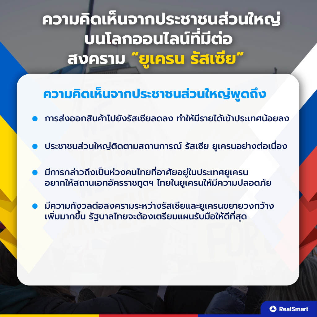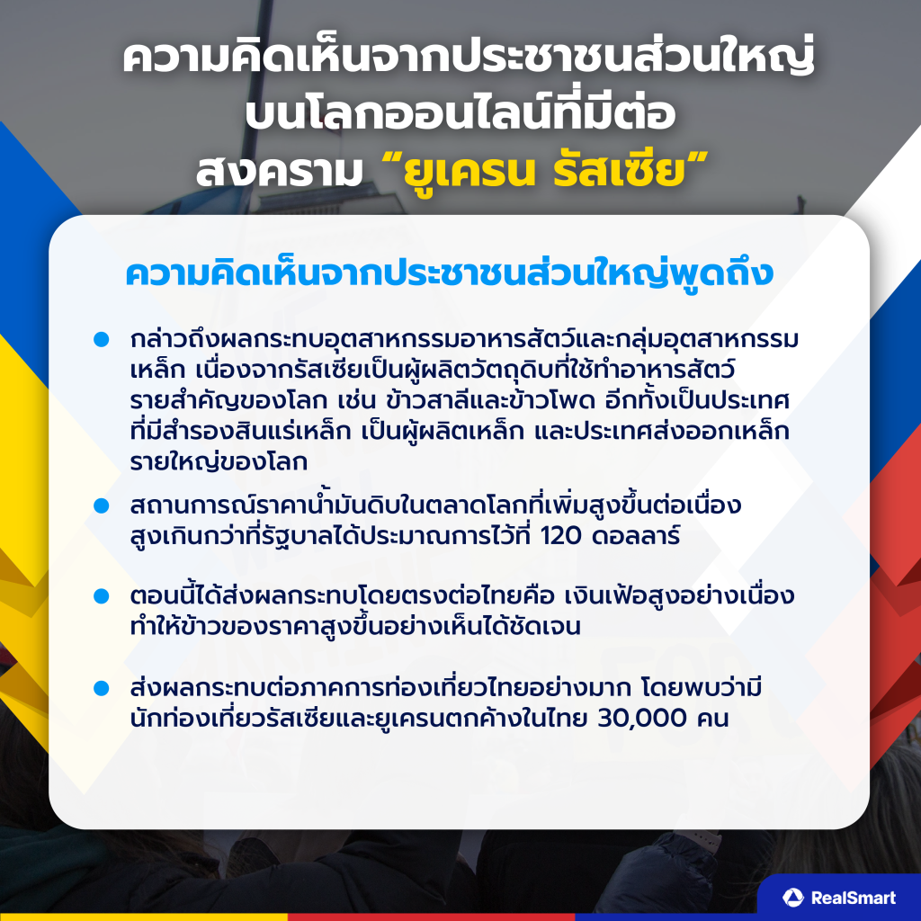ในส่วนความคิดเห็นของคนไทยในโลกออนไลน์เกี่ยวกับ “สงครามระหว่างยูเครนและรัสเซีย” ที่ทุกคนมองไปในทิศทางผลกระทบจากเหตุการณ์ไม่ว่าจะเป็น ผลกระทบในกลุ่มอุตสาหกรรมอาหาร กลุ่มอุตสาหกรรมด้านพลังงาน ค่าเงินเฟ้อในไทยสูงขึ้น อุตสาหกรรมนักท่องเที่ยวจากรัสเซียที่เข้ามาประเทศไทยมากเป็นอันดับต้น ๆ และส่งผลกระทบถึงนักท่องเที่ยวจากรัสเซียและยูเครนที่ไม่สามารถกลับประเทศได้ เนื่องจากไม่สามารถใช้บัตรเครดิตของ Visa และ Master Card ที่ได้ทำการคว่ำบาตรประเทศรัสเซีย  รวมถึงการส่งออกสินค้าจากไทยไปรัสเซียนั้นลดลง ทั้งหมดนี้สร้างความกังวลให้กับคนไทยจำนวนมาก และอยากให้รัฐบาลไทยเตรียมแผนรับมือไว้