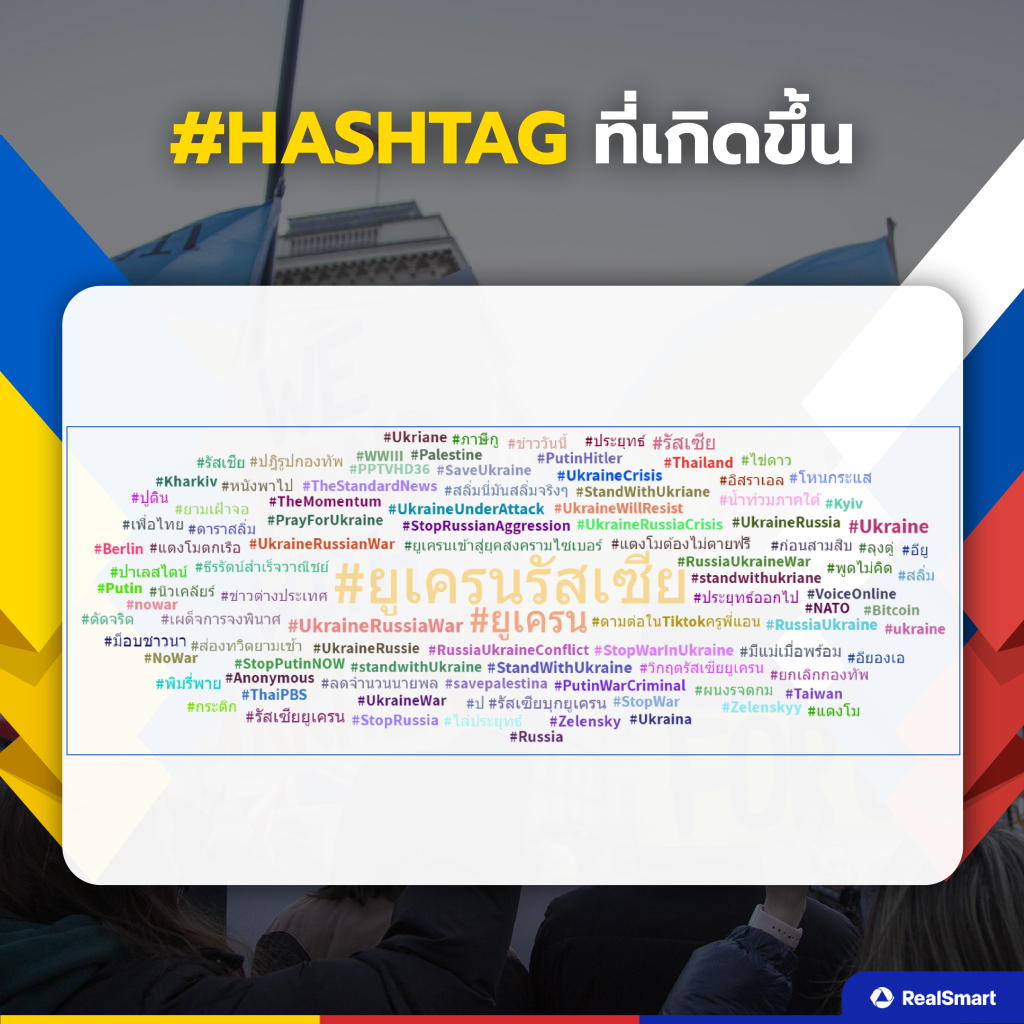 Top #Hashtag ที่เกิดขึ้นเกี่ยวกับผลกระทบจากสงครามระหว่างยูเครน และรัสเซีย นั้นมีอยู่มากมายทั้งภาษาไทยและอังกฤษ แต่ที่เห็นได้ชัดเจนจะเป็น #ยูเครนรัสเซีย #UkraineRussiaWar #ยูเครน  และอื่น ๆ หากใครสนใจสามารถไปตามดูใน Hashtag เกิดขึ้นได้เช่นกัน