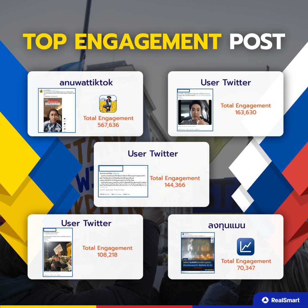 ในส่วนของ top Engagment Post ทั้ง 5 อันดับที่ได้รับความสนใจจากผู้คนจำนวนมากนั้นมาจากการที่อัปเดตข่าวสาร เหตุการณ์ที่เกิดขึ้นระหว่างยูเครนและรัสเซีย โดยเฉพาะ twitter ที่ติดมาถึง 3 tweet เลย และที่สร้างเซอร์ไพรส์เลยคือ TikTok ที่ได้รับ engagement สูงที่สุด ใน ส่วน Facebook Page : ลงทุนแมน ได้รับ engagement เยอะที่สุดในช่องทาง Facebook