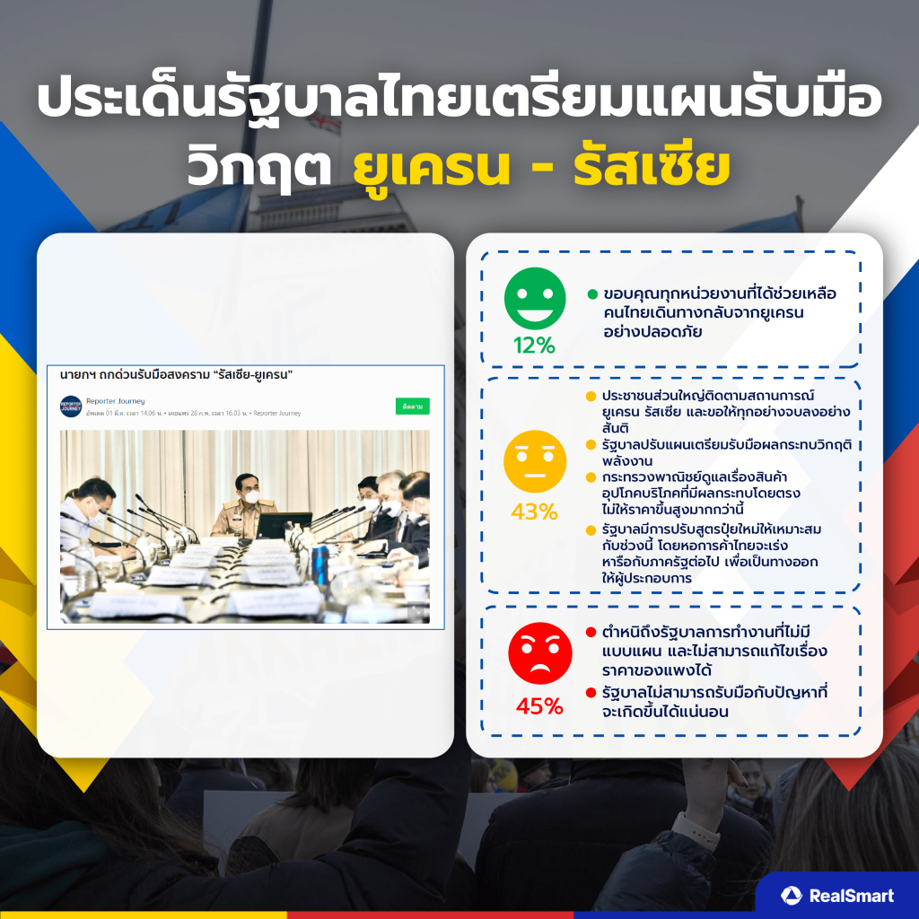 ในส่วนของประเด็นที่ได้รับความสนใจนั้น Real Smart ได้ทำการแยกข้อมูล และได้ประเด็นออกมาอยู่ 2 ประเด็น ได้แก่ รัฐบาลไทยเตรียมแผนรับมือวิกฤติ ยูเครน – รัสเซีย และผลกระทบกับประเทศไทยจากสงครามยูเครน – รัสเซีย ซึ่งในแต่ละประเด็นนั้นจะมีส่วนของความรู้สึกคนไทยที่แสดงออกมา มาเริ่มเจาะลึกลงไปในแต่ละประเด็นกัน