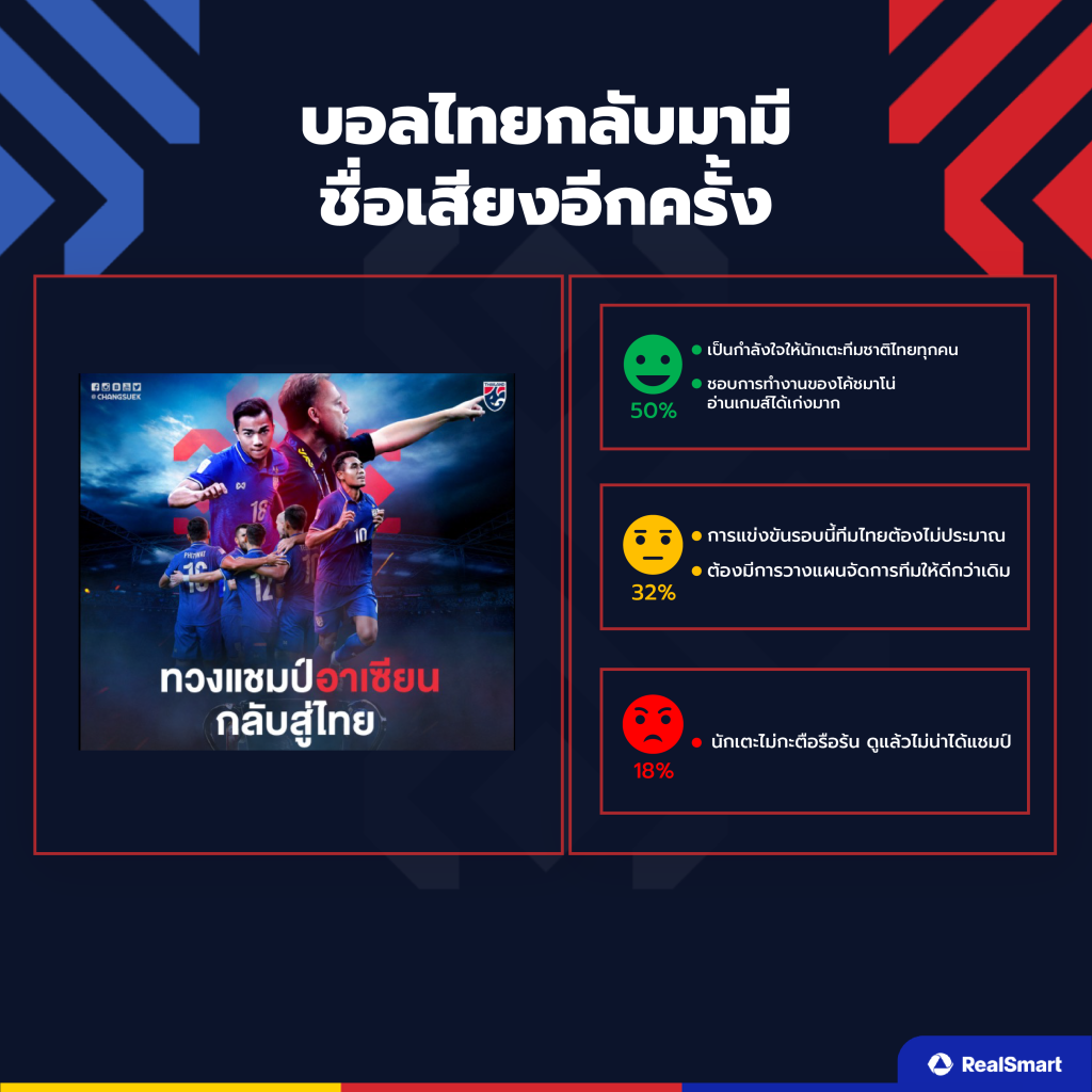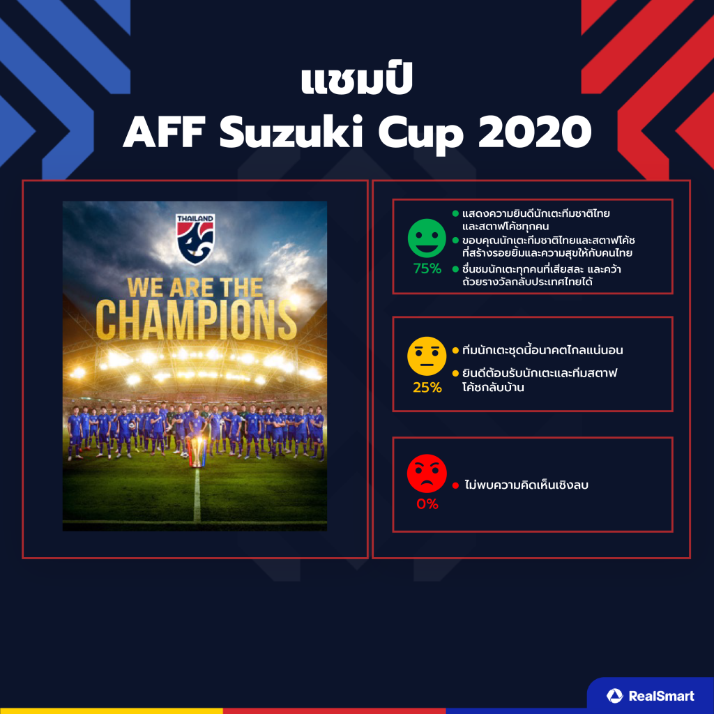 ทิศทางของความรู้สึกในประเด็นนี้ไปในทางบวกถึง 75% มากกว่าประเด็นอื่น ๆ คนไทยในโลกออนไลน์ออกมาชื่นชม แสดงความยินดี และขอบคุณที่คว้าแชมป์มาเป็นของขวัญปีใหม่ให้กับคนไทย และเชิงทั่วไป 25% มองว่านักเตะชุดนี้อนาคตไกลแน่นอน พัฒนาได้อีกเยอะ และไม่มีความเห็นเชิงลบเลย