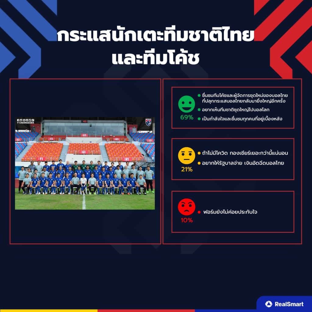 ในภาพรวมถือว่าไปในทิศทางที่ดีมากเป็นความเห็นเชิงบวกถึง 69% ออกมาคนไทยชื่นชมโค้ช ทีมงาม ผู้จัดการทีมและนักเตะทุกคน และมีความเห็นเชิงทั่วไป 21% ที่แอบเสียดายที่มีการแพร่ระบาดของโควิด ไม่อย่างนั้นกองเชียร์เยอะกว่านี้แน่นอน แต่ยังมีหลายคนที่ไม่ประทับใจฟอร์มการเล่นความเห็นเชิงลบอยู่ 10%