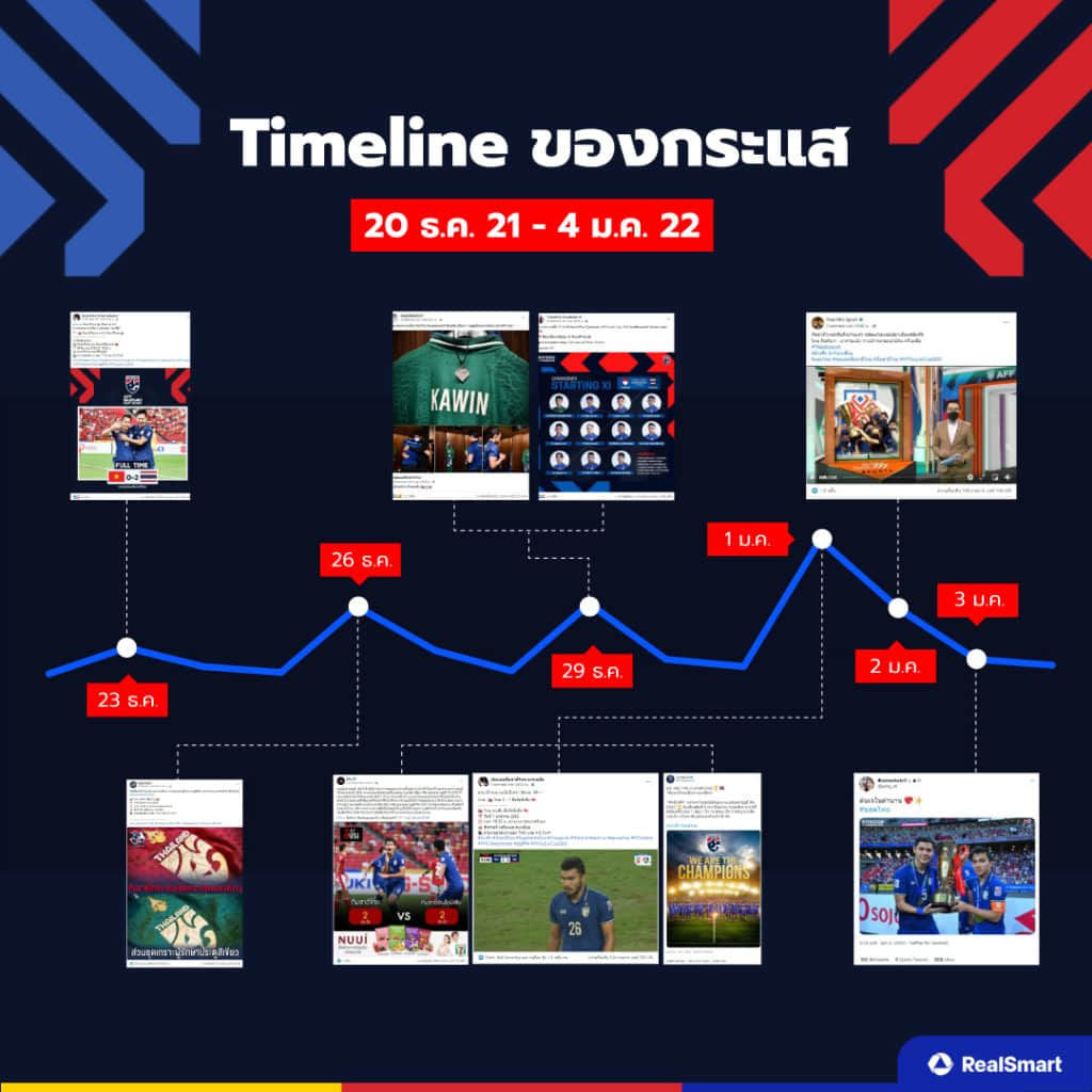 มีความน่าสนใจอย่างหนึ่งใน Timeline นี้ก็คือ ทุกครั้งที่มีแมตช์ลงแข่งของทีมชาติไทยกราฟจะพุ่งขึ้นอย่างชัดเจนและลดลงในวันต่อมา ซึ่งก่อน Timeline นี้ทีมชาติไทยเป็นแชมป์กลุ่ม A ในรอบแบ่งกลุ่มเก็บได้ 12 แต้มเต็มเข้าสู่รอบรองชนะเลิศพบกับคู่ปรับตลอดกาลอย่างทีมชาติเวียดนามที่ชาวเน็ตข่มกันไม่พักตั้งแต่ก่อนการแมตช์นี้จะเริ่มขึ้นอีก ในวันที่ 23 ธันวาคม 2564 กราฟพุ่งขึ้น เพราะมีการแข่งขันนัดแรกของรอบรองชนะเลิศ สุดท้ายทีมชาติไทยเอาชนะทีมชาติเวียดนามไป 2 – 0 และได้มีเพจ Facebook : ฟุตบอลทีมชาติไทย แฟนคลับ โพสต์รูปผลการแข่งขันทำให้เป็นที่พูดถึงในโลกออนไลน์อยู่พอสมควร และกราฟก็ค่อย ๆ ลดลงหลังจากการแข่งขัน