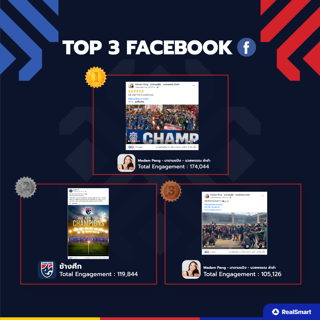 ไม่แปลกใจเลยที่ทั้ง 2 เพจที่ได้รับ engagement เยอะ เพราะคอบอลทั้งหลายต้องติดตามเพจ Facebook มาดามแป้ง และ ช้างศึก อยู่แล้ว เพื่ออัปเดตข่าวสารเกี่ยวกับฟุตบอลทีมชาติไทย