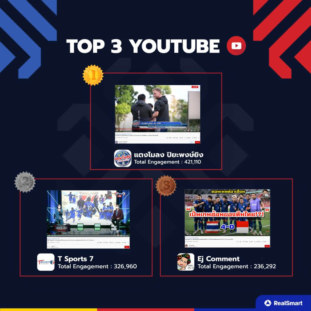ส่วน YouTube สาวกทีมชาติต้องดูช่อง แตงโมลง ปิยะพงษ์ยิง อยู่แล้ว เพราะทุกครั้งก่อนเกมส์การแข่งขันทางช่องจะออกมาวิเคราะห์นักเตะ 11 คนแรกได้แม่นสุด ๆ ทำให้ได้รับ engagement เยอะ ส่วน YouTube อีก 2 ช่องที่เป็นสายกีฬาอยู่แล้วทั้ง T Sports 7 และ Ej Comment