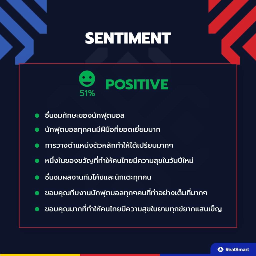 Positive sentiment (ความเห็นเชิงบวก) 51% รู้สึกชื่นชมทักษะของนักฟุตบอล กับฝีมือที่ยอดเยี่ยม โค้ชทีมชาติไทยวางตำแหน่งตัวหลักทำให้ในการแข่งขันได้เปรียบมาก ๆ ขอบคุณนักฟุตบอลที่ตั้งใจทำหน้าที่อย่างเต็มที่แชมป์ในครั้งนี้เป็นของขวัญให้กับแฟนบอลชาวไทยในวันปีใหม่ และทำให้คนไทยมีความสุขในยามทุกข์ยากแสนเข็ญ