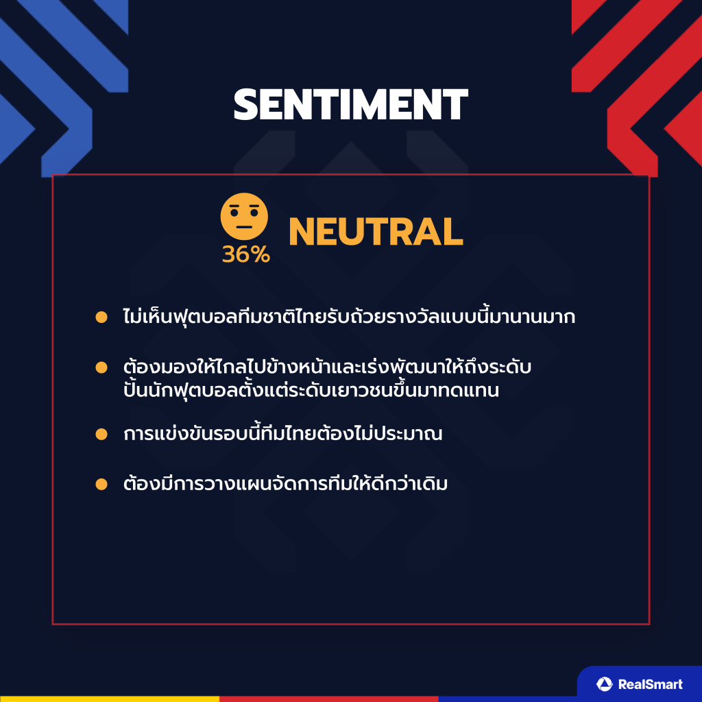 Neutral Sentiment (ความเห็นเชิงทั่วไป) 36% บอกว่าไม่เห็นฟุตบอลทีมชาติไทยรับถ้วยรางวัลแบบนี้มานาน ต้องต่อยอดความสำเร็จต้องมีการวางแผนที่ดีกว่านี้ ต้องมองให้ไกลไปข้างหน้าและเร่งพัฒนาให้ถึงระดับปั้นนักฟุตบอลตั้งแต่ระดับเยาวชนขึ้นมาทดแทน