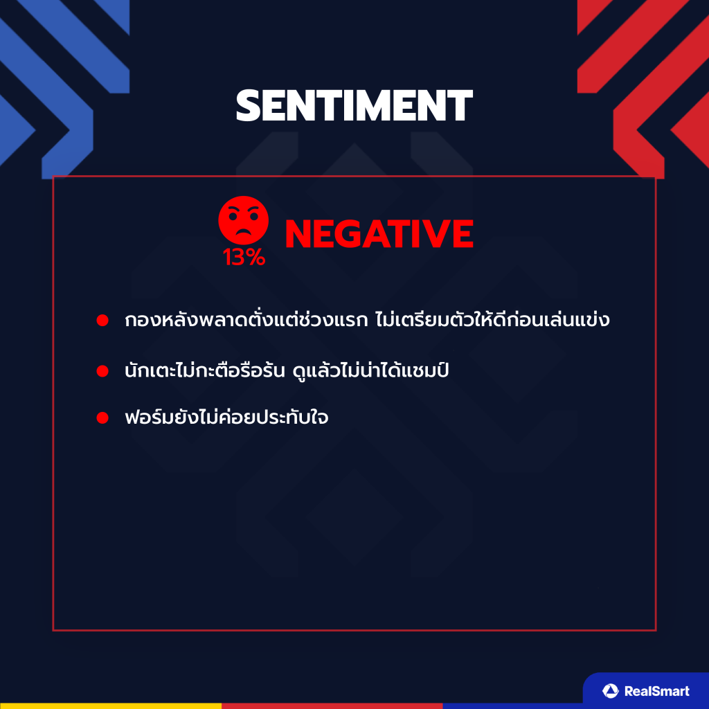 Negative Sentiment (ความเห็นเชิงลบ) 13% มองว่ากองหลังพลาดตั้งแต่ช่วงแรก ไม่เตรียมตัวให้ดีก่อนแข่ง นักเตะไม่กระตือรือร้น ดูแล้วไม่น่าได้แชมป์ รวมถึงฟอร์มของทีมยังไม่ค่อยน่าประทับใจ