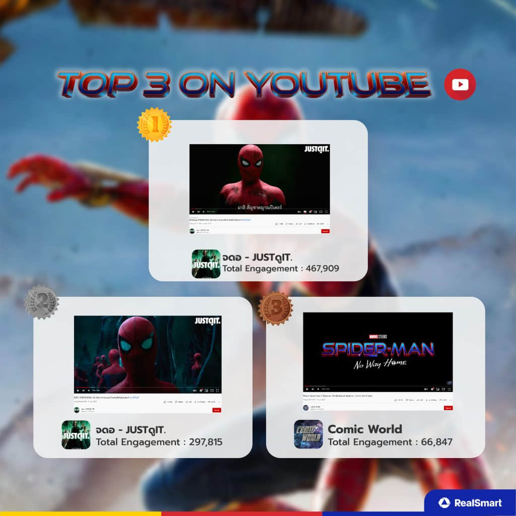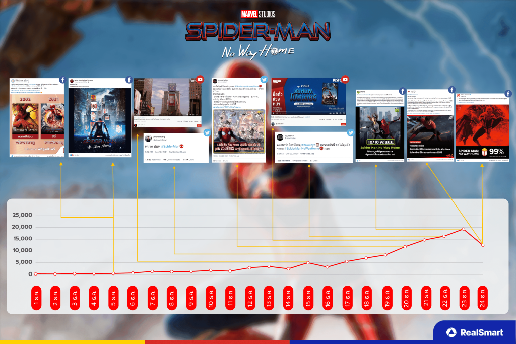 กระแสเริ่มพุ่งสูงขึ้นในวันที่ 18 ธันวาคม 2564 หลัง Twitter : MarvelThaiFan tweet ที่ภาพยนตร์ภาคต่อกวาดรายได้ไปแล้วกว่า 253 ล้านเหรียญในสหรัฐฯ และทั่วโลกไปกว่า 500+ ขึ้นอันดับต่าง ๆ กันเป็นว่าเล่นเลย วันที่ 19 ธันวาคม 2564 มี Twitter ส่วนตัวคนดัง tweet ว่า “พนจก ปบฟ #Spiderman” เหล่าแฟนคลับที่ติดตามได้ retweet & quote tweet อยู่พอสมควรกัน ต่อมาวันที่ 21 ธันวาคม 2564 YouTube : จอดอ – JUSTดูIT ปล่อยคลิป “รีบรีวิว SPIDER-MAN : No Way Home ตอบโจทย์แฟนไอ้แมงมุม” เกี่ยวกับภาพรวมของหนังที่ก่อนที่จะเข้าฉายในไทยว่าดีอย่างไร