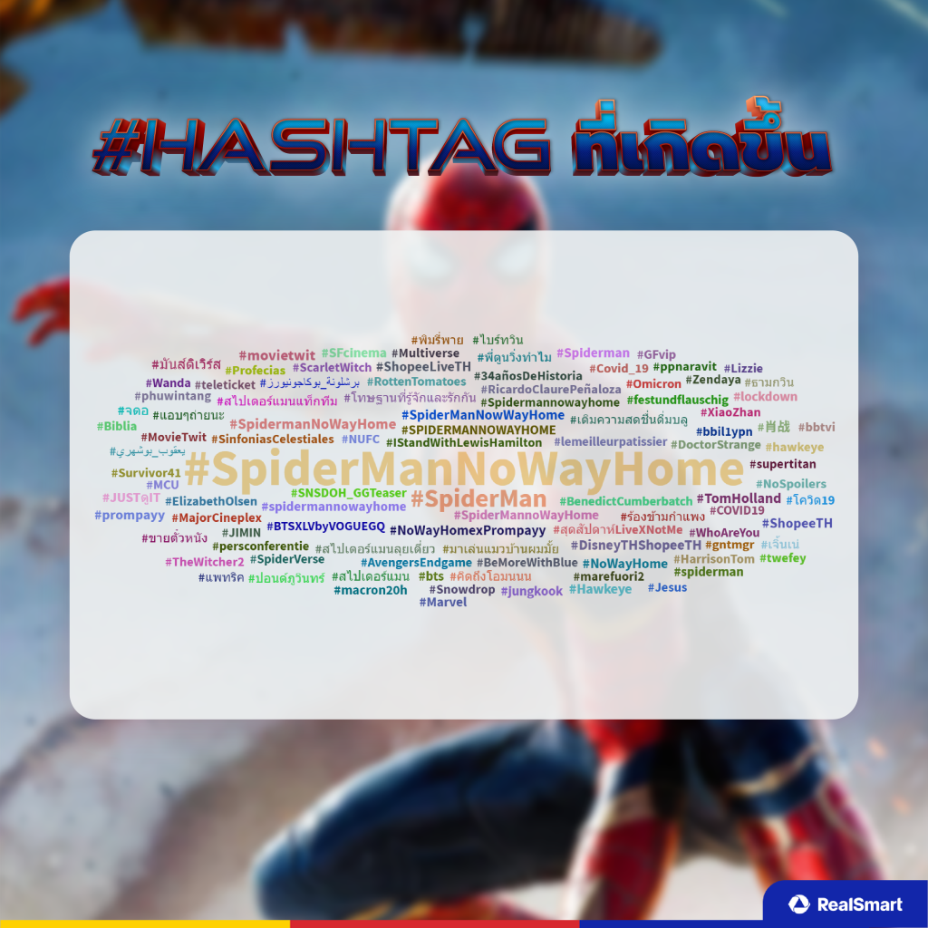 Top #Hashtag ที่เกิดขึ้นเกี่ยวกับกระแส Spider-Man No Way Home มีอยู่มากมาย แต่ที่เห็นได้ชัดเจนจะเป็น #SpiderManNoWayHome #Spiderman #TomHolland และอื่น ๆ หากใครสนใจสามารถไปตามดูใน Hashtag เกิดขึ้นได้เช่นกัน