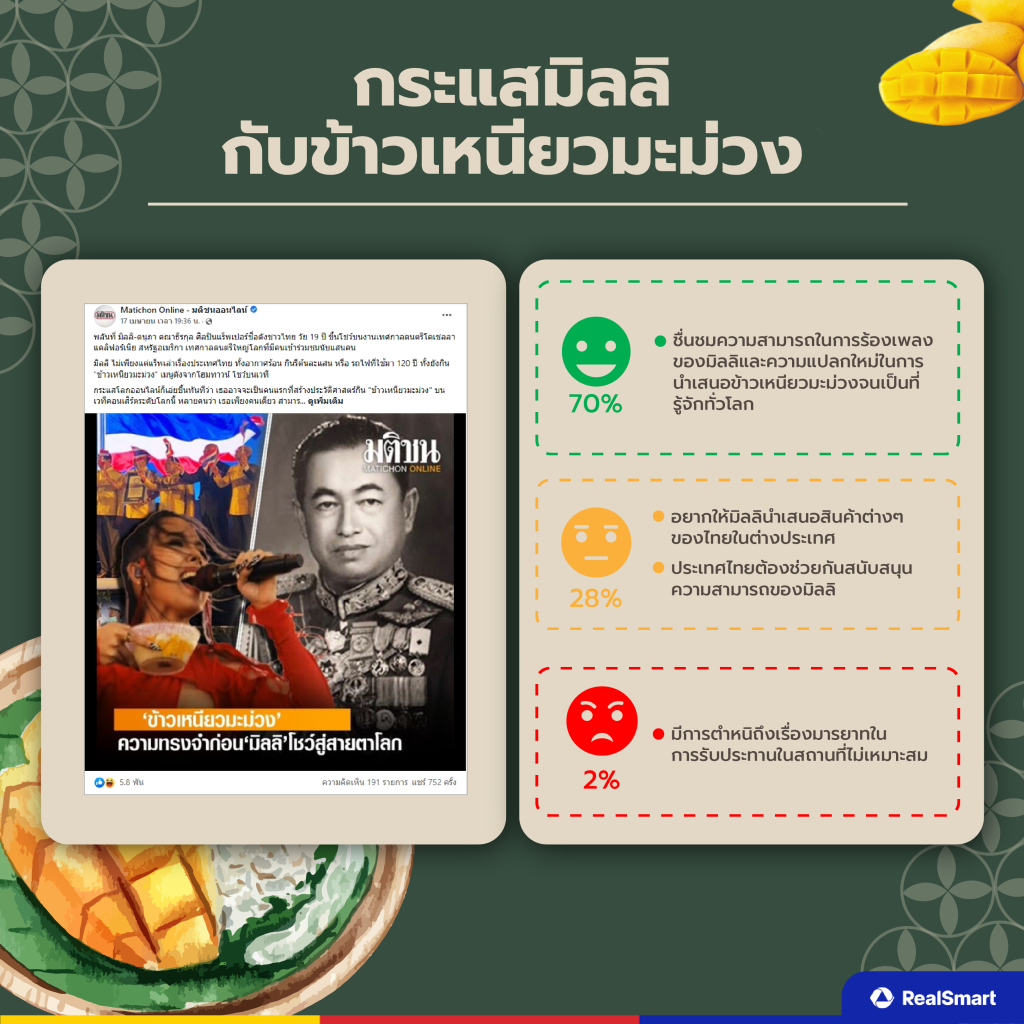 จากข้อมูลที่ Real Smart รวบรวมผ่าน Social Listening มานั้นจะพบว่ามีอยู่ 2 ประเด็นหลัก ๆ ที่คนไทยพูดถึงและให้ความสนใจเป็นจำนวนมาก คือ กระแสข้าวเหนียวมะม่วง และ มิลลิกับข้าวเหนียวมะม่วง โดยที่ในแต่ละประเด็นก็จะมีความคิดเห็นและมุมมองที่แตกต่างกันออกไป ที่นี่เรามาเจาะลึกไปทีละประเด็นกัน