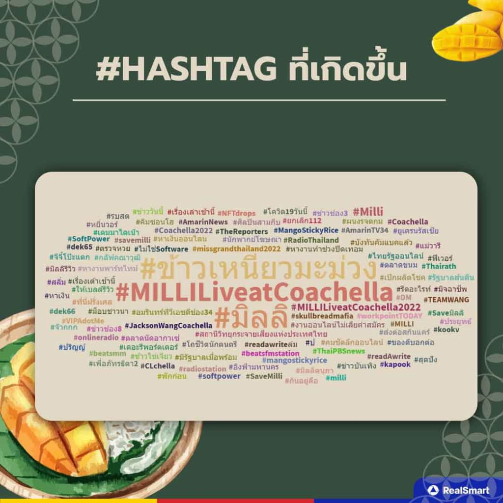 Top #Hashtag ที่เกิดขึ้นเกี่ยวกับกระแสข้าวเหนียวมะม่วงฟีเวอร์นั้นมีอยู่มากมายทั้งภาษาไทยและอังกฤษ แต่ที่เห็นได้ชัดเจนจะเป็น #ข้าวเหนียวมะม่วง #MILLILiveatCoachella #มิลลิ และอื่น ๆ หากใครสนใจสามารถไปตามดูใน Hashtag เกิดขึ้นได้เช่นกัน