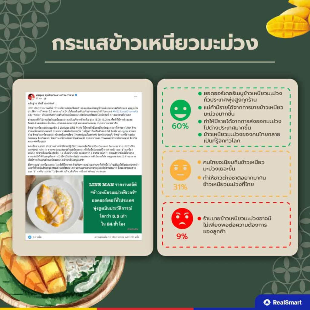Real Smart ได้รวบรวมข้อมูลกระแสข้าวเหนียวมะม่วงผ่าน Social Listening ทั้งในส่วนของความคิดเห็น ความรู้สึก มุมมองต่าง ๆ ที่เกิดขึ้นจากคนไทยในโลกออนไลน์ทั้งหมดออกมาให้ทุกคนได้อ่านกัน