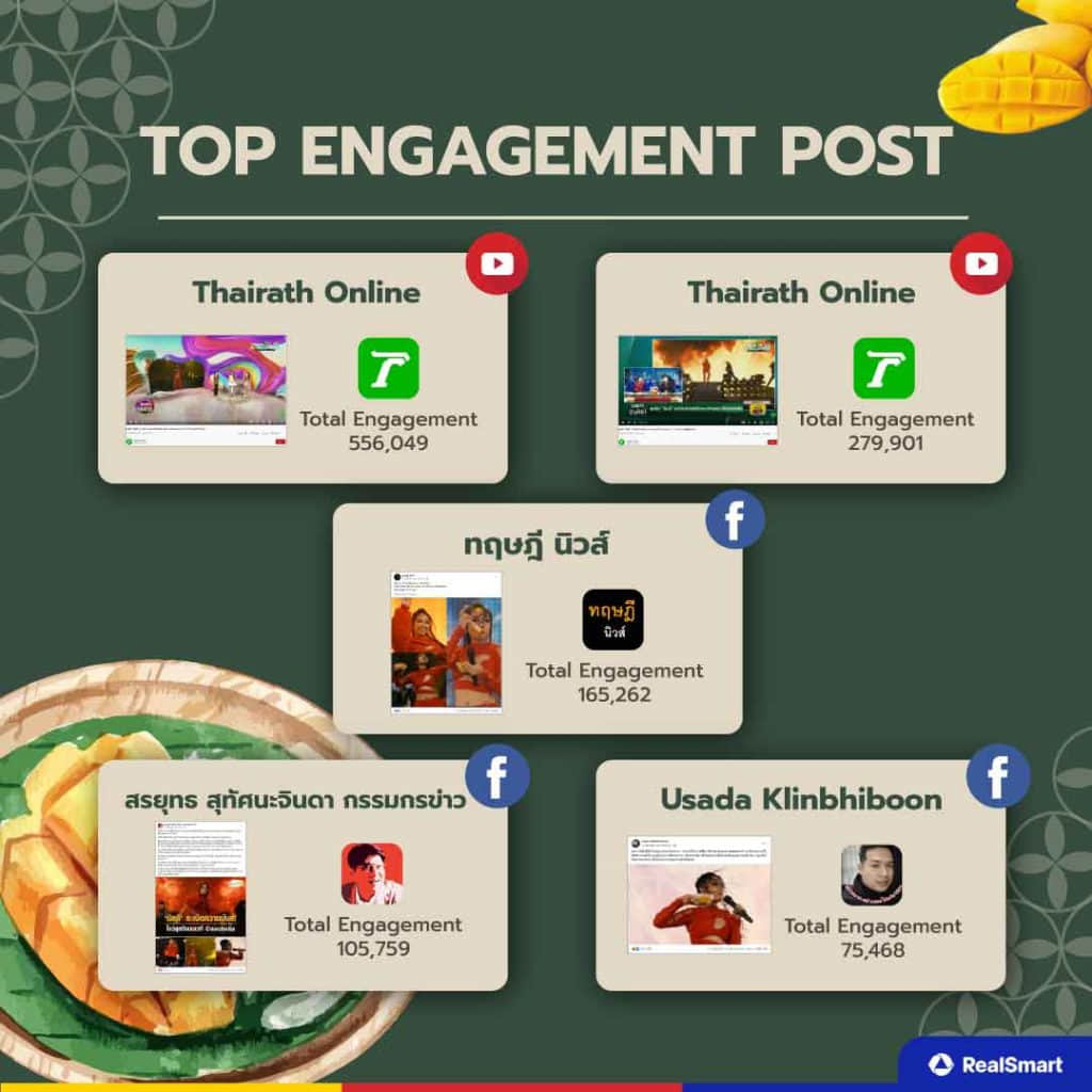 สำหรับ Top Engagement Post เกี่ยวกับกระแสข้าวเหนียวมะม่วง พบว่า 5 อันดับแรกเป็นช่องทางหลักอย่าง YouTube และ Facebook ที่คนไทยมักตามดูข่าวสาร หรือเหตุการณ์ต่าง ๆ และ 4 อันดับแรกเป็นสำนักข่าว และนักข่าวชื่อดังที่ออกมาพูดถึงกระแสข้าวเหนียวมะม่วงกัน ทำให้ได้รับความสนใจจากคนไทยสูงมาก