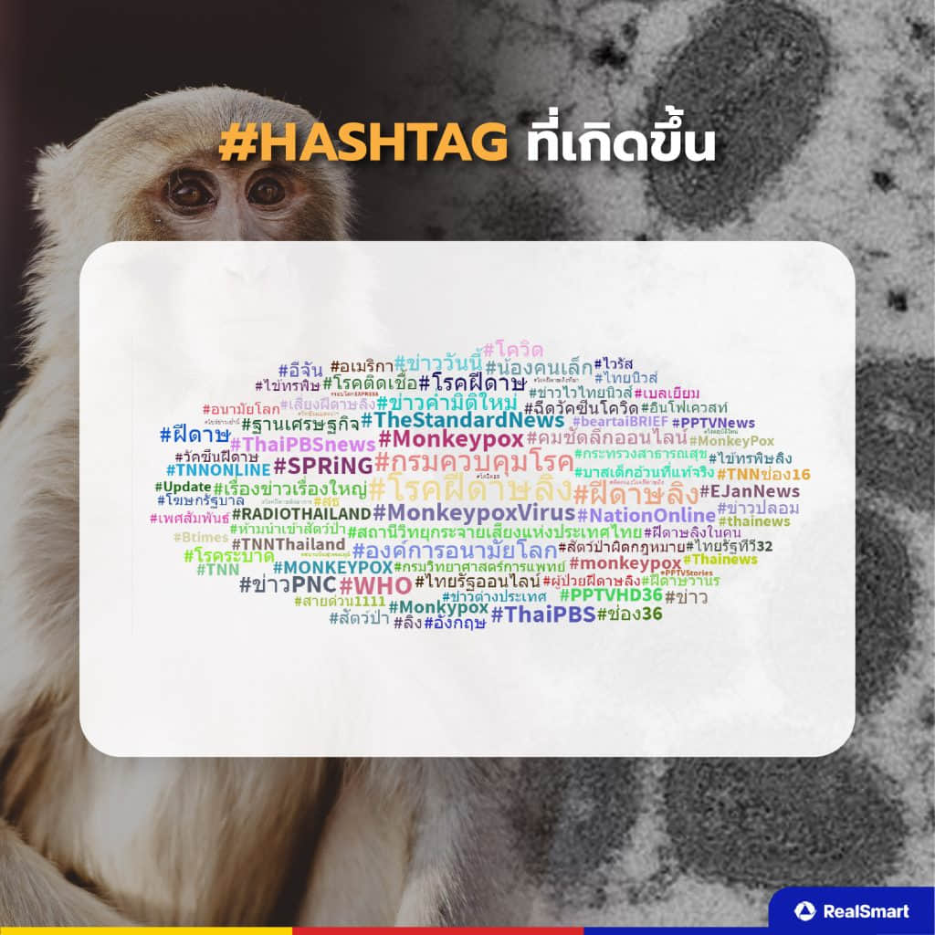 Top #Hashtag ที่เกิดขึ้นเกี่ยวกับประเด็นโรคฝีดาษลิงนั้นมีอยู่มากมาย แต่ที่เห็นได้ชัดเจนที่เป็นภาษาไทย #กรมควบคุมโรค #โรคฝีดาษลิง #ฝีดาษลิง  และอื่น ๆ หากใครสนใจสามารถไปตามดูใน Hashtag เกิดขึ้นได้เช่นกัน
