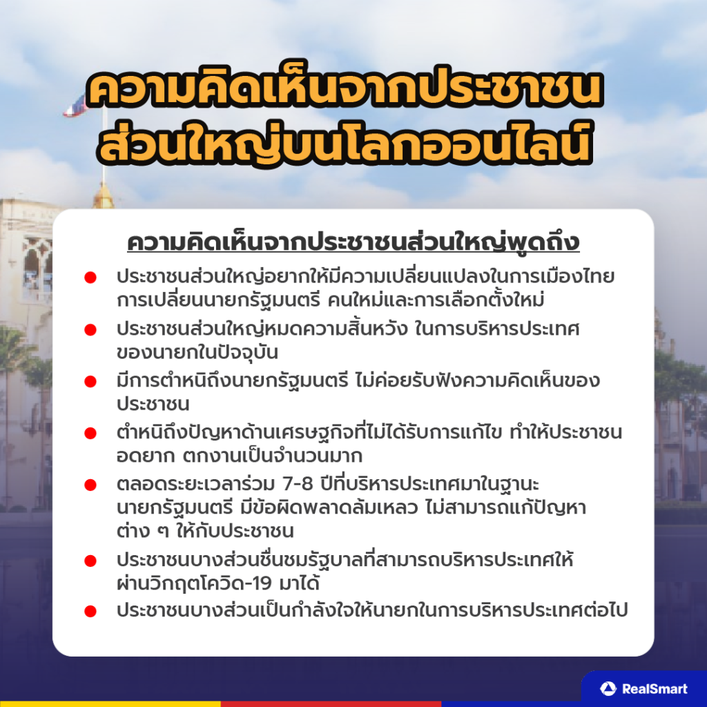 จากข้อมูลที่ Real Smart ได้รวบรวมผ่าน Social Listening เกี่ยวกับประเด็นครบวาระ 8 ปีของนายกฯ ซึ่งความคิดเห็นส่วนใหญ่ไปในทิศทางเดียวกันแทบจะทั้งหมด