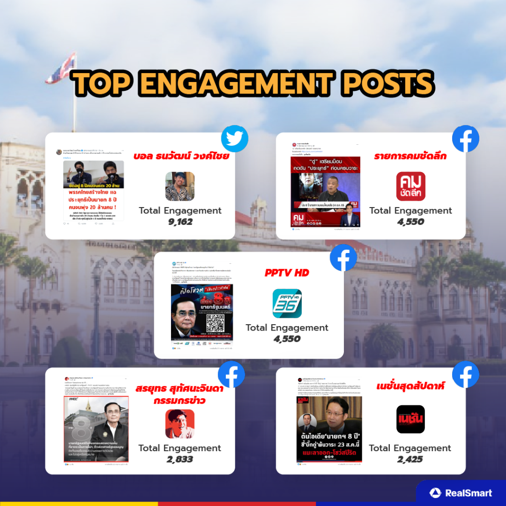 ในส่วนของ Top Engagement พบว่าช่องทาง Facebook และ Twitter เป็นช่องทางหลักที่คนไทยในโลกออนไลน์ใช้ติดตามประเด็นนี้ เนื่องจากสามารถติดตามสถานการณ์ได้ตลอดเวลาจากสำนักข่าว และบุคคลที่พูดถึงเรื่องการเมืองอยู่เป็นประจำ