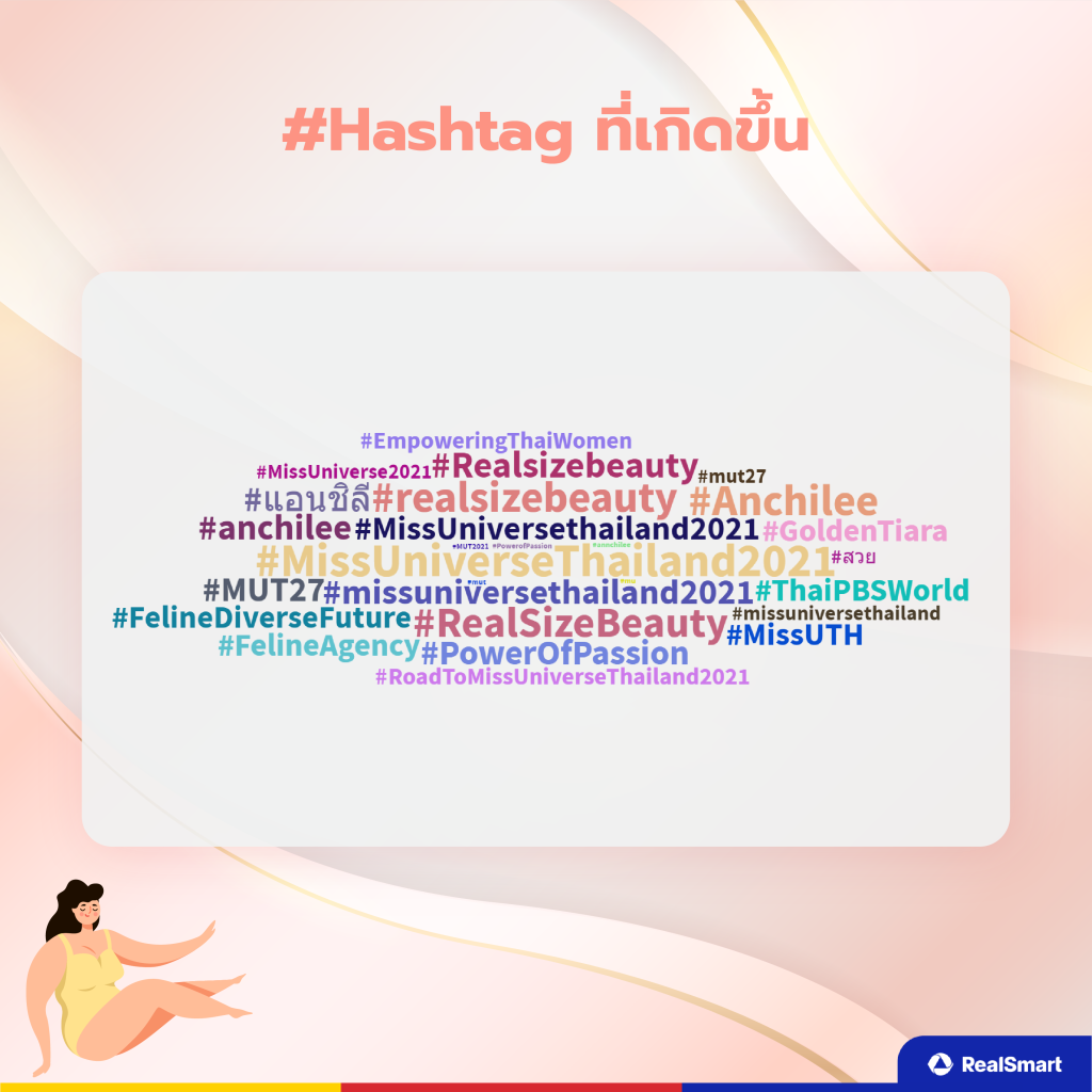Top #Hashtag ที่เกิดขึ้นเกี่ยวกับกระแส Real Size Beauty มีอยู่มากมาย แต่ที่เห็นได้ชัดเจนจะเป็น #MissUniverseThailand2021 #RealSizeBeauty #anchilee และอื่น ๆ หากใครสนใจสามารถไปตามดูใน Hashtag เกิดขึ้นได้เช่นกัน