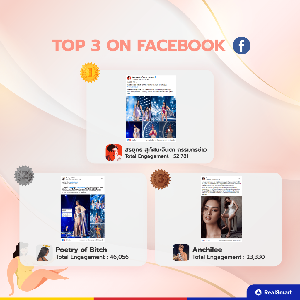 โดยที่อันดับที่ 1 และ 2 เป็นเพจ Facebook นั้นมีคนติดตามเยอะทุกครั้งที่มีประเด็นไหนที่พูดถึงในเพจมักได้รับความสนใจสูง ส่วนอันดับที่ 3 เป็นเพจ Facebook ของคุณแอนชิลี ตัวแทนประเทศไทยในการประกวด Miss Universe เป็นที่สนใจของคนไทยที่ติดตามดูความเคลื่อนไหวของผู้เข้าประกวด