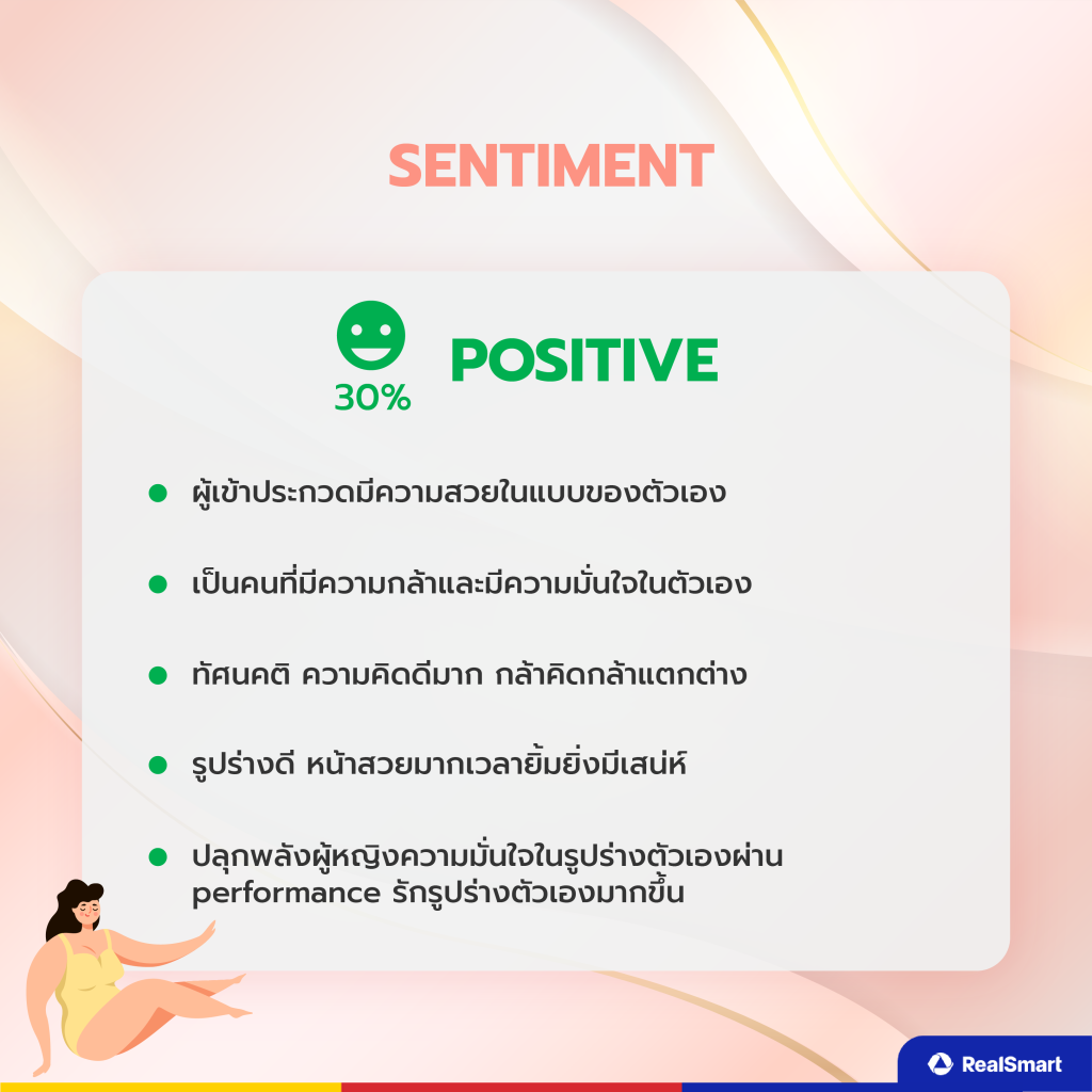 Positive (ความเห็นเชิงบวก) 39% รู้สึกว่าสามารถปลุกพลังผู้หญิงสร้างความมั่นใจในรูปร่างตัวเองผ่าน performance รักรูปร่างตัวเองมากขึ้น เป็นแรงบันดาลใจให้ผู้หญิงหลาย ๆ คนเปลี่ยนทัศนคติไปในเชิงบวก