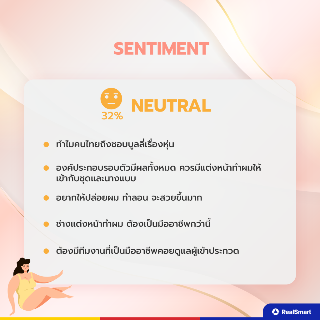 Neutral Sentiment (ความเห็นเชิงทั่วไป) 32% มองว่าทำไมคนไทยถึงชอบบูลลี่เรื่องหุ่น ยิ่งในตอนประกวดนั้นองค์ประกอบรอบตัวมีผลทั้งหมด ควรมีการแต่งหน้าทำผมให้เข้ากับชุดและนางแบบ อยากให้ปล่อยผม ทำลอน จะสวยขึ้นมาก อีกทั้งต้องมีทีมงานที่เป็นมือาชีพคอยดูแลผู้เข้าประกวด