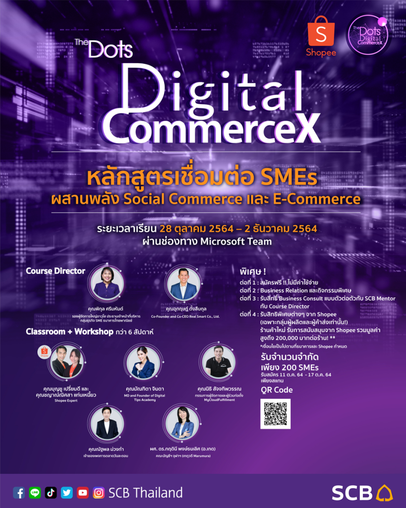 ออนไลน์ ไม่ใช่ทางเลือก ไม่ใช่ทางรอด แต่เป็นทางที่จำเป็นต้องทำสำหรับธุรกิจ ในยุคแห่งความไม่แน่นอน ที่ทุกอย่างมีความเปลี่ยนอย่างรวดเร็ว ที่ผ่านมาโควิดถือเป็นตัวเร่งที่ทำให้ภาพของอนาคตชัดและเข้าใกล้เรามากขึ้น ดังนั้น SCB จึงได้มีการจัดทำหลักสูตร The Dots Digital Commerce X ขึ้นมา เพื่อช่วยเหลือผู้ประกอบการ SME ในการปรับตัวเข้าสู่โลกออนไลน์ที่จะไม่ใช่แค่ช่วยให้พวกเขาอยู่รอดท่ามกลางวิกฤตเท่านั้น แต่สามารถเติบโตได้อย่างยั่งยืนในทุกสถานการณ์